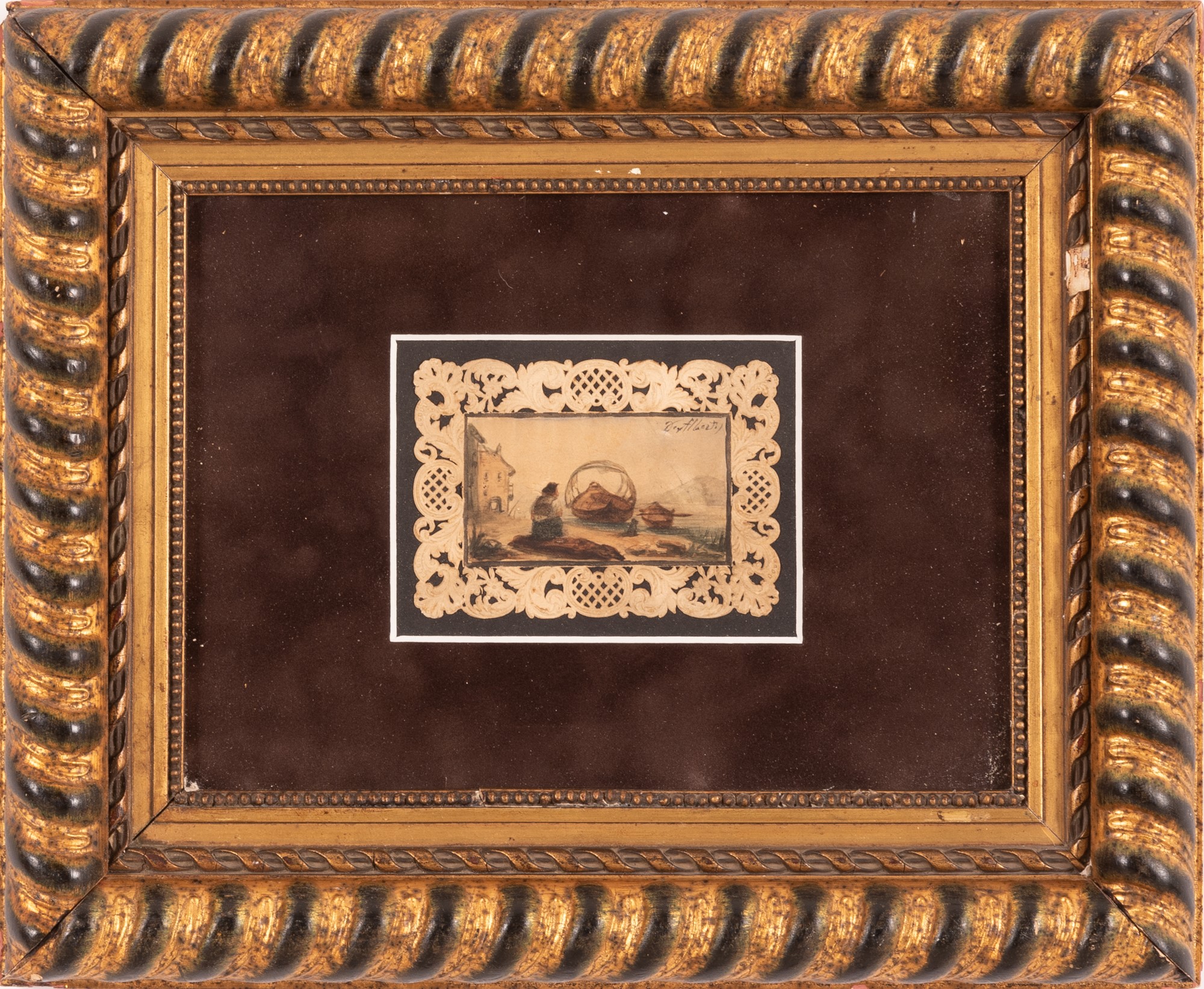 Sebastiano De Albertis (Milano, 1828 - Milano, 1897) Marina con pescatore e barche Tempera su carta cm 5x8; con cornice cm 30x37