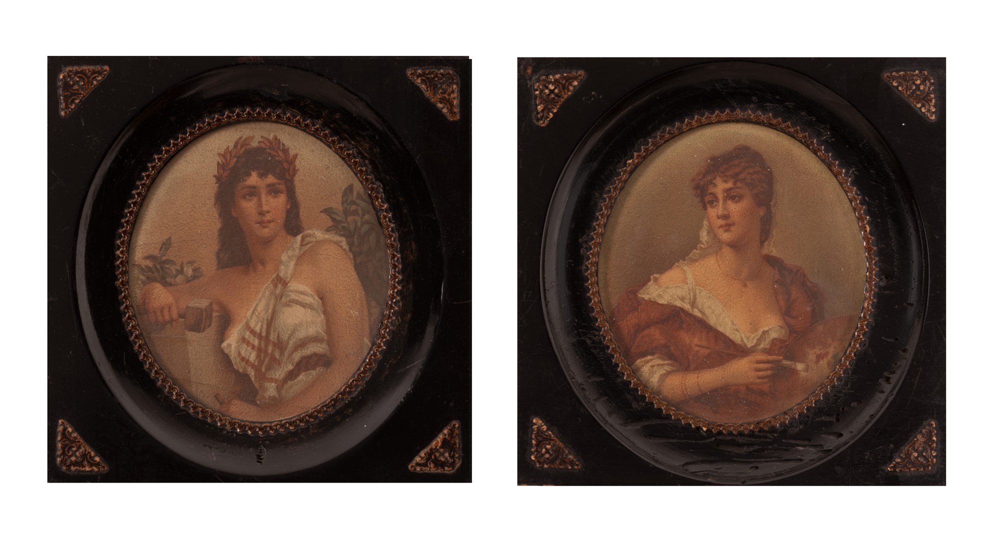 Coppia di ritratti femminili in cornice ebanizzata coeva