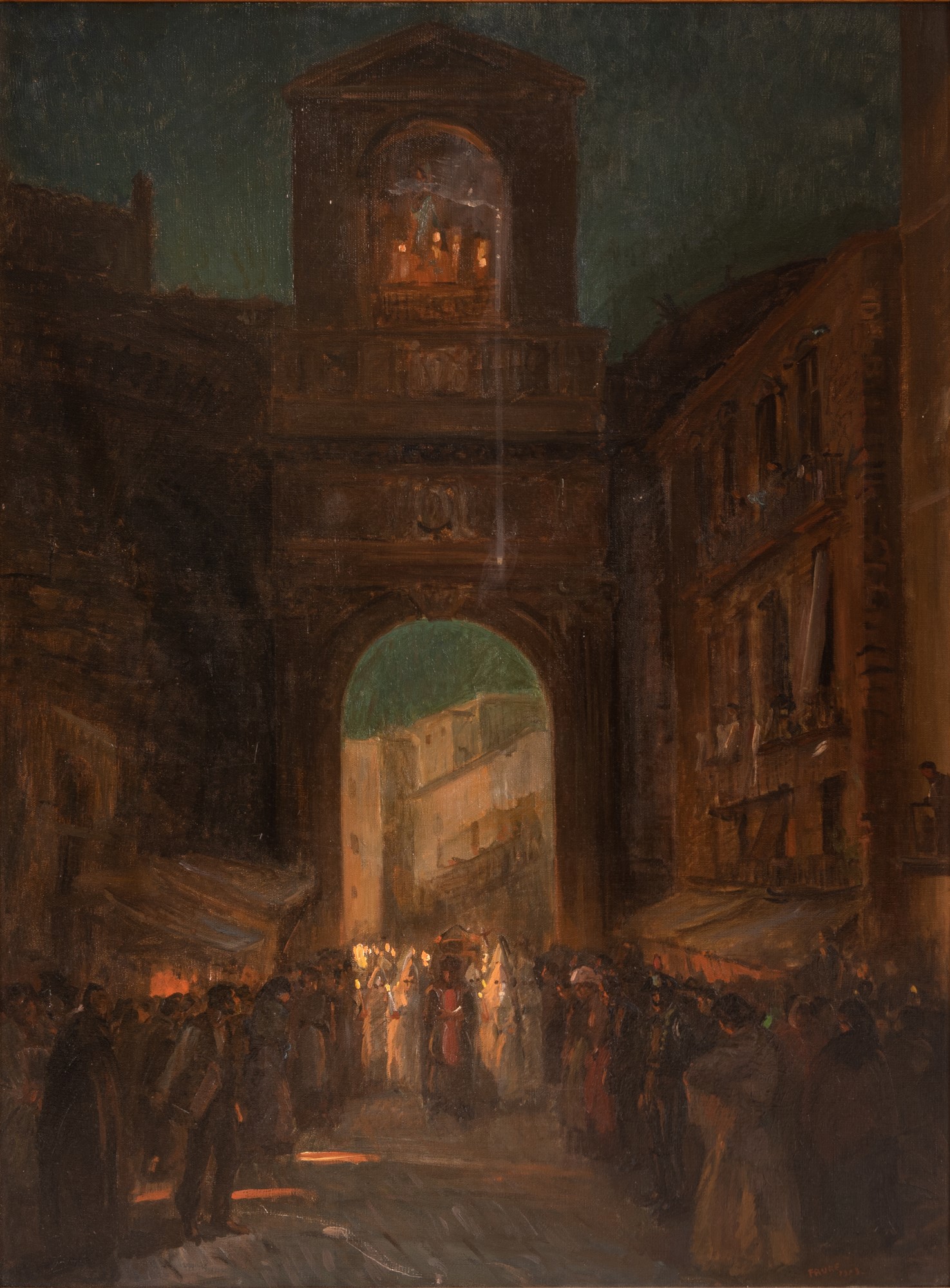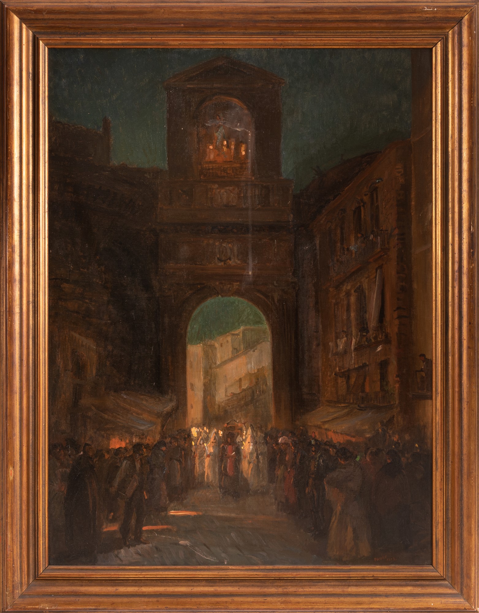 Amandus Faure (Amburgo, 1874 - Stoccarda, 1931) Processione a Porta Capuana Olio su tela cm 110x80; con cornice cm 124x98