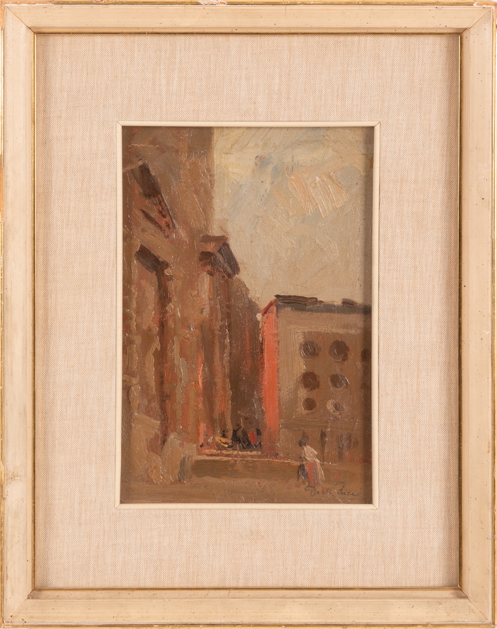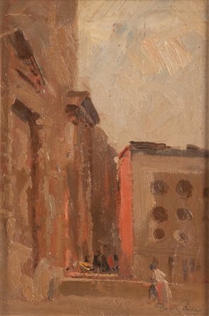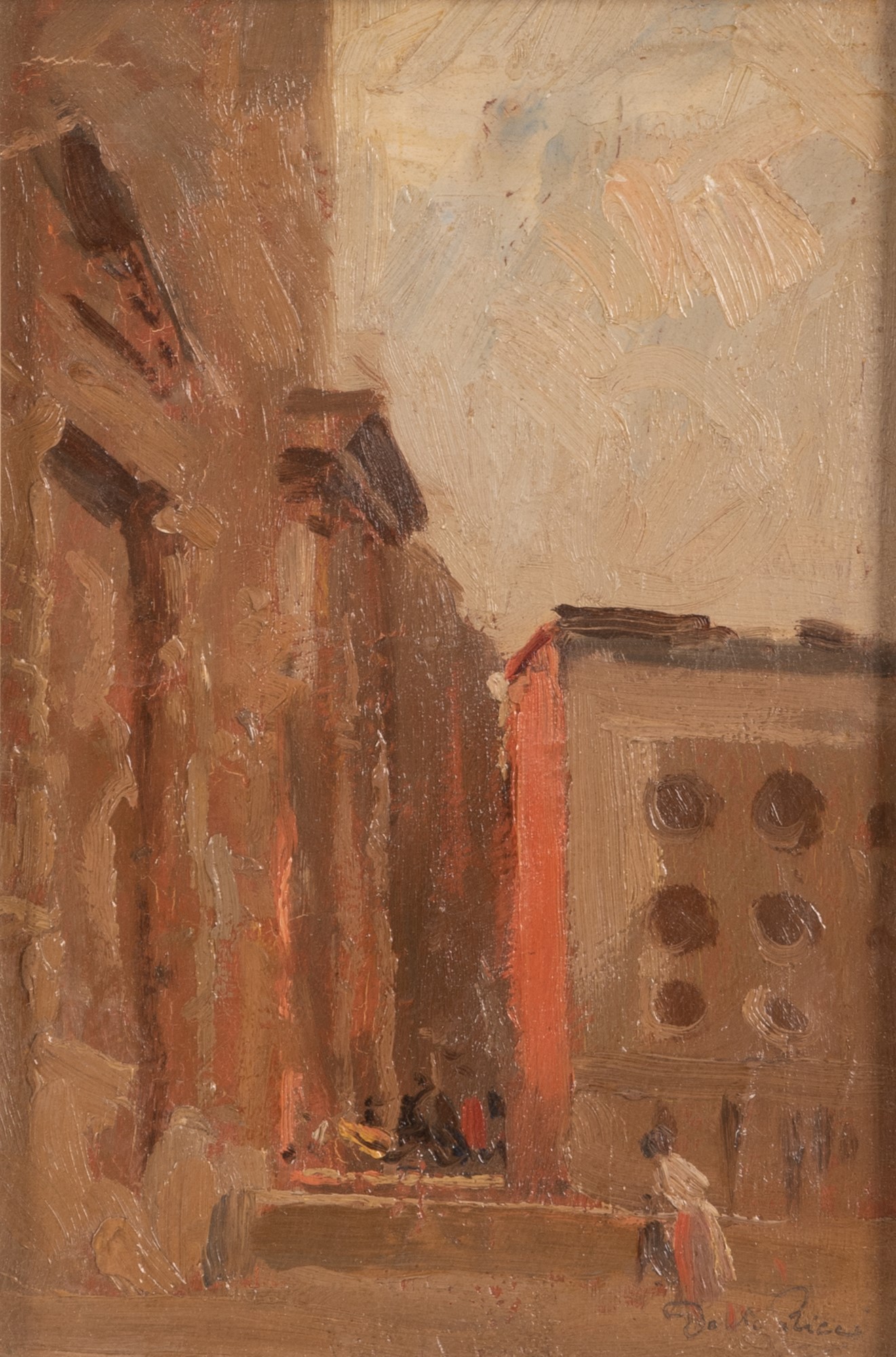 Dante Ricci (Serra San Quirico, 1879 - Roma, 1957) Scorcio di Roma con figure olio su cartone telato cm 24x17; con cornice cm 40x32