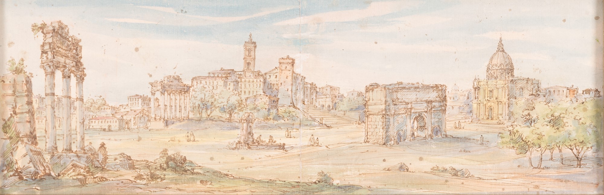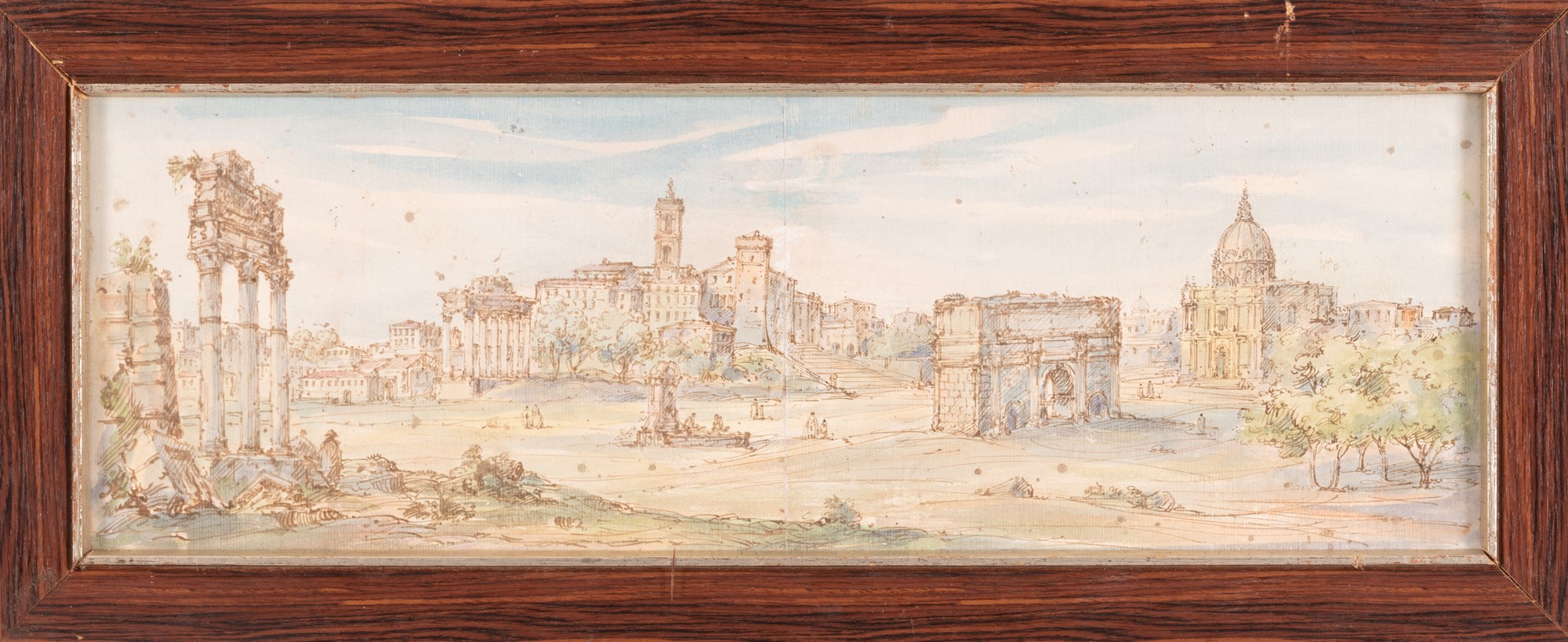 Paesaggio romano con rovine fine XIX secolo Disegno acquerellato cm 21x60; con cornice cm 28x68