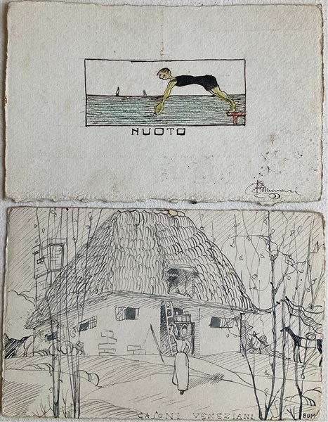 due cartoline, una a china su carta l'altra ad acquerello e china su carta