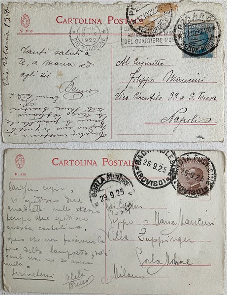 una firmata B. Munari l'altra siglata BUM. Dedicate e firmate Bruno al retro. Viaggiate con timbro recante data 1925 e 1922 (lievi difetti)
