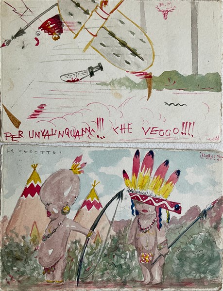 Bruno Munari "Le vedette! " "Che veggo!" due cartoline a china e acquerello su