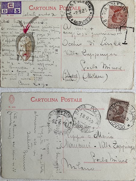 una firmata Bruno Munari e l'altra siglata B.M. con testa di cervo. Dedicate, iscritte e firmate al retro Bruno e Cervo Rosso. Viaggiate con timbro recante data 1925 e 1923 (lievi difetti)