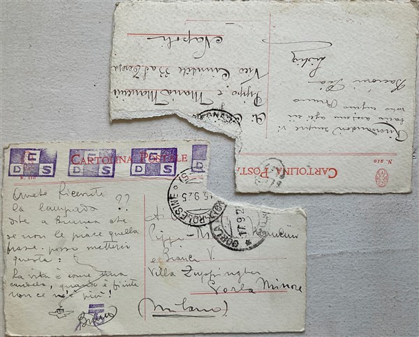 firmate Bruno. Dedicate e firmate Bruno al retro. Una riportante frase: "La virtù è come una candela, quando è finita non c'è n'è più!. Cartoline viaggiate (entrambe mancanti di una parte per asportare i francobolli), timbro recante data 1925 (l'altro non leggibile) (difetti e mancanze)