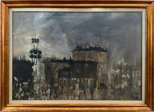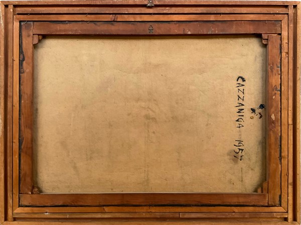Giancarlo Cazzaniga "Periferia" 1957 olio su tela cm 70x100 firmato e datato in