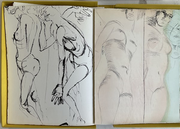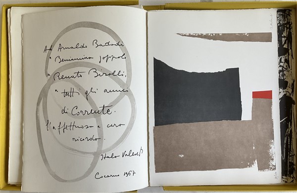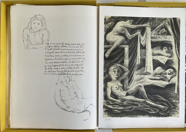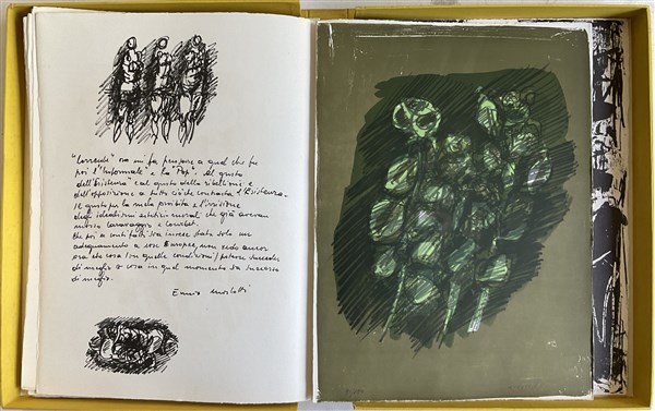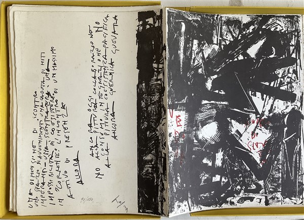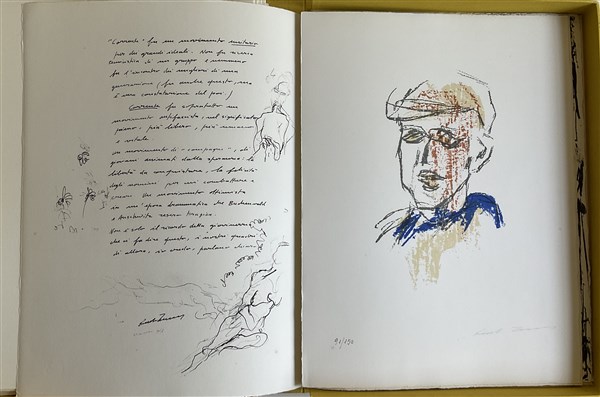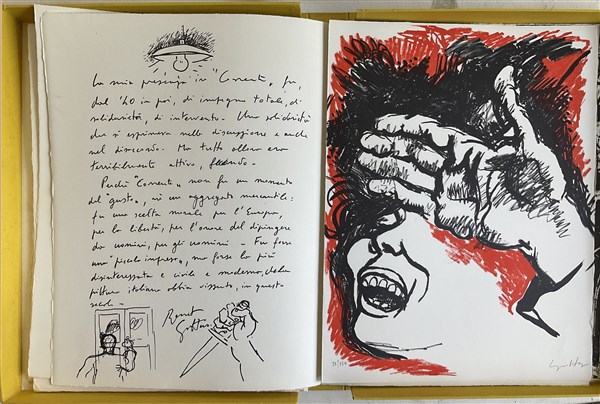 cartella contenente 12 litografie di diversi artisti (Arnaldo Badoni, Renato Birolli, Bruno Cassinari, Sandro Cherchi, Lucio Fontana, Renato Guttuso, Giuseppe Migneco, Ennio Morlotti, Aligi Sassu, Ernesto Treccani, Italo Valenti, Emilio Vedova) ciascuna contenuta in quartino riproducente in litografia testi autografi e disegni degli artisti. Tutte firmate e numerate. Es. 91/150, Teodorani Editore, in scatola originale (difetti alla cartella - lievi difetti alle stampe)