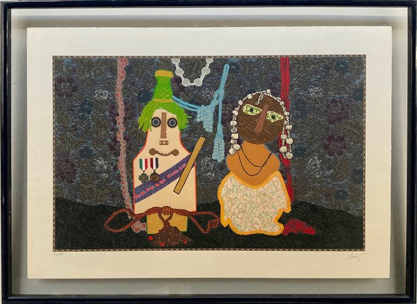 Enrico Baj "Coppia regale" 1989 serigrafia e collage su carta cm 69,5x99,5 firma