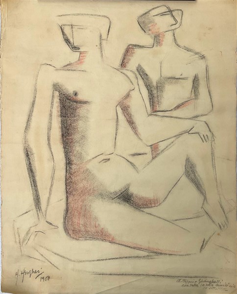 Lotto composto da tre disegni a tecnica mista raffiguranti nudi di misure diverse, uno di Heinz Henghes, firmato, datato 1950 e dedicato a Peppino Ghiringhelli e una stampa raffigurante veduta di città, tutti arrotolati