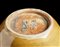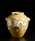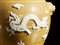 Cina, dinastia Qing, XIX secolo . . Cm 28,00 x 26,00. Vaso con ampia pancia e corto collo cilindrico, ricoperto di invetriatura color ocra. Decorazione bianca in rilievo con dragone alla ricerca della perla fiammeggiante ed elementi floreali.