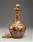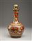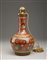Cina, XX secolo . . Cm 40,00. Vaso a bottiglia con corpo globulare e lungo collo strombato, l'esterno smaltato con simboli di buon auspicio entro rondelle su sfondo rosso. Marchio a sigillo Qianlong in rosso sulla base.