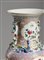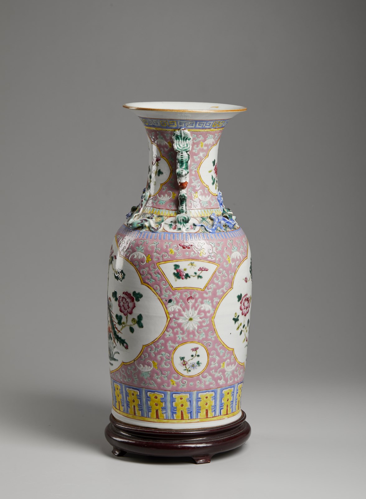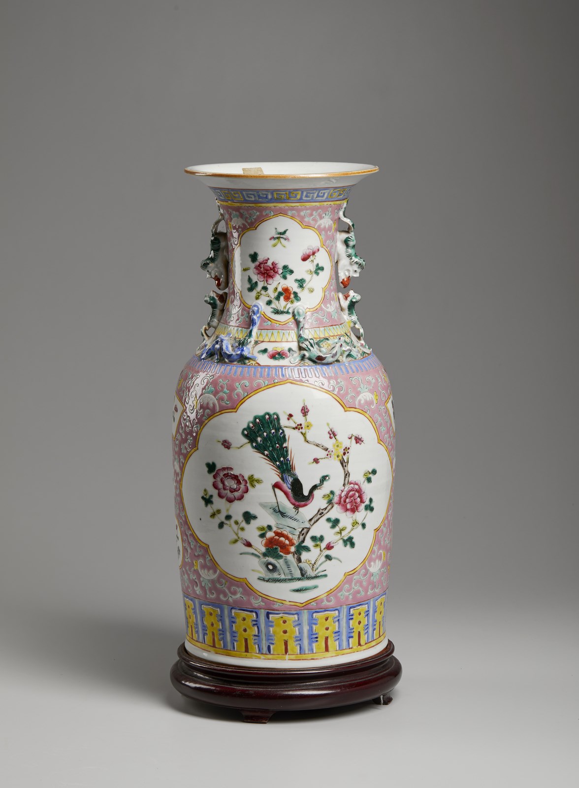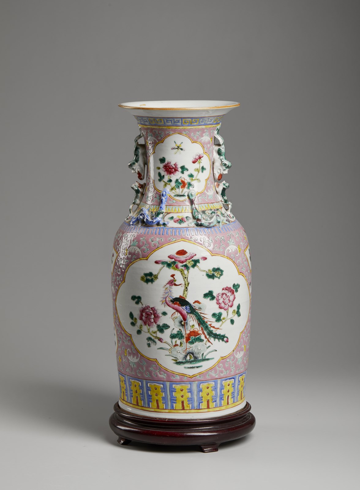 Cina, XX secolo . . Cm 20,00 x 43,50. Vaso a balaustro decorato con pavoni e fiori entro cartucce polilobate a loro volta poggianti su uno sfondo di tralci poggianti su un tappeto rosato.