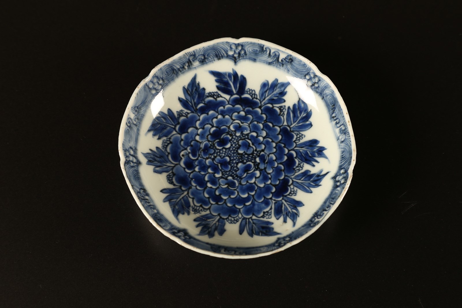Cina, dinastia Qing . . Cm 16,00 x 3,50. Piccolo piatto decorato con grande peonia centrale - considerata il re dei fiori- e motivo a rocce e onde ripetuto sotto il bordo superiore interno ed esterno. Marchio apocrifo Chenghua entro cerchio sulla base.