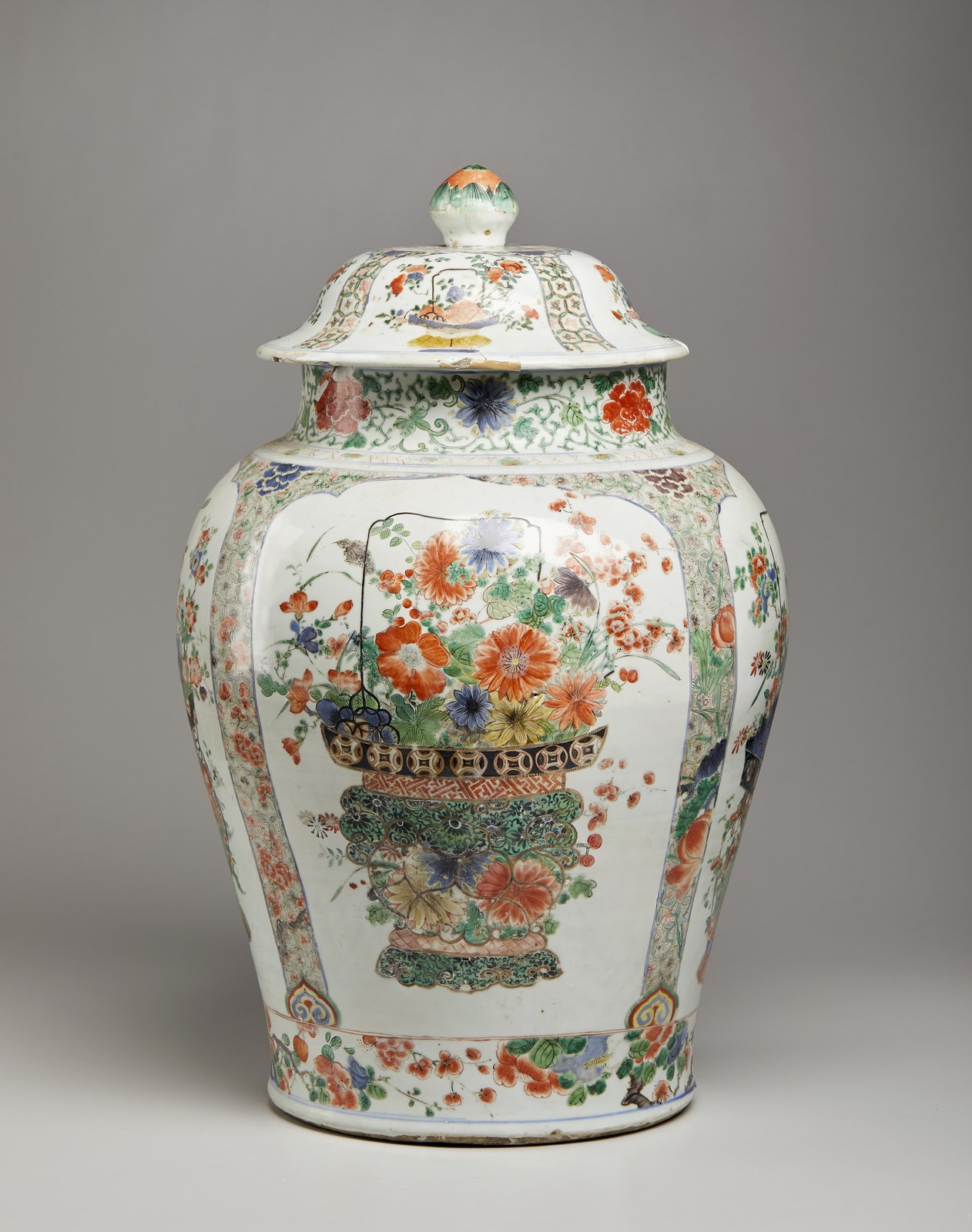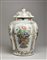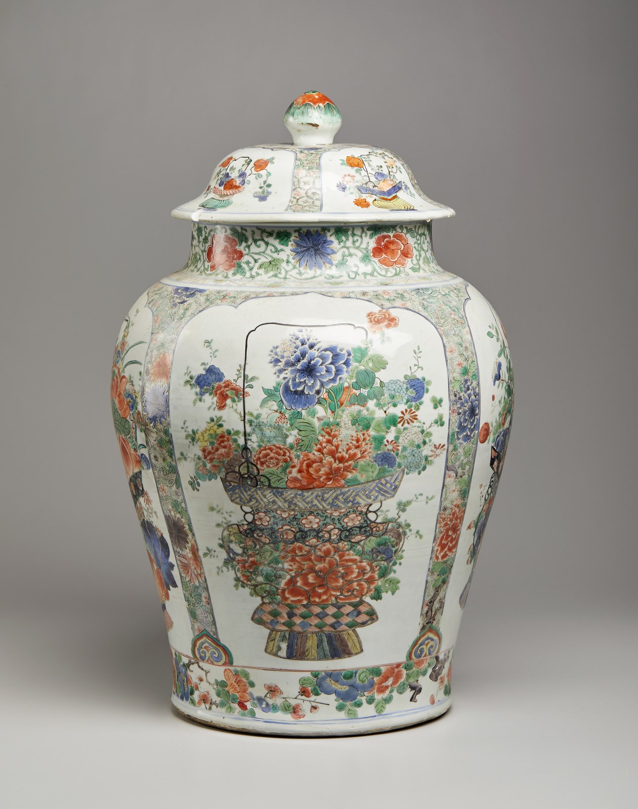 Cina, dinastia Qing, periodo Kangxi, XVIII secolo . . Cm 40,00 x 59,00. Grande vaso con coperchio, l'esterno finemente dipinto nei colori della famiglia rosa con vasi di fiori entro grandi riserve lobate; interstizi con fiori e tralci vegetali.