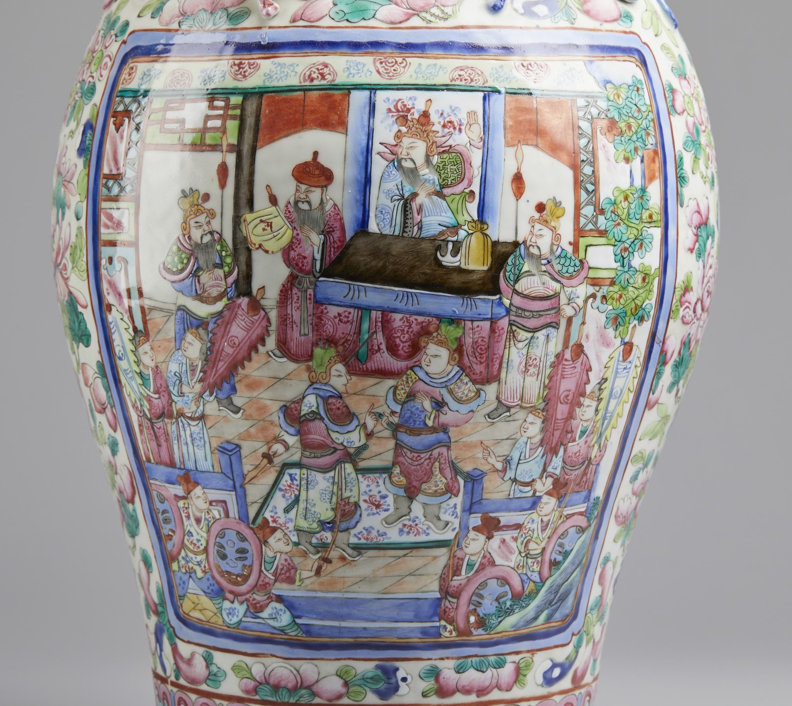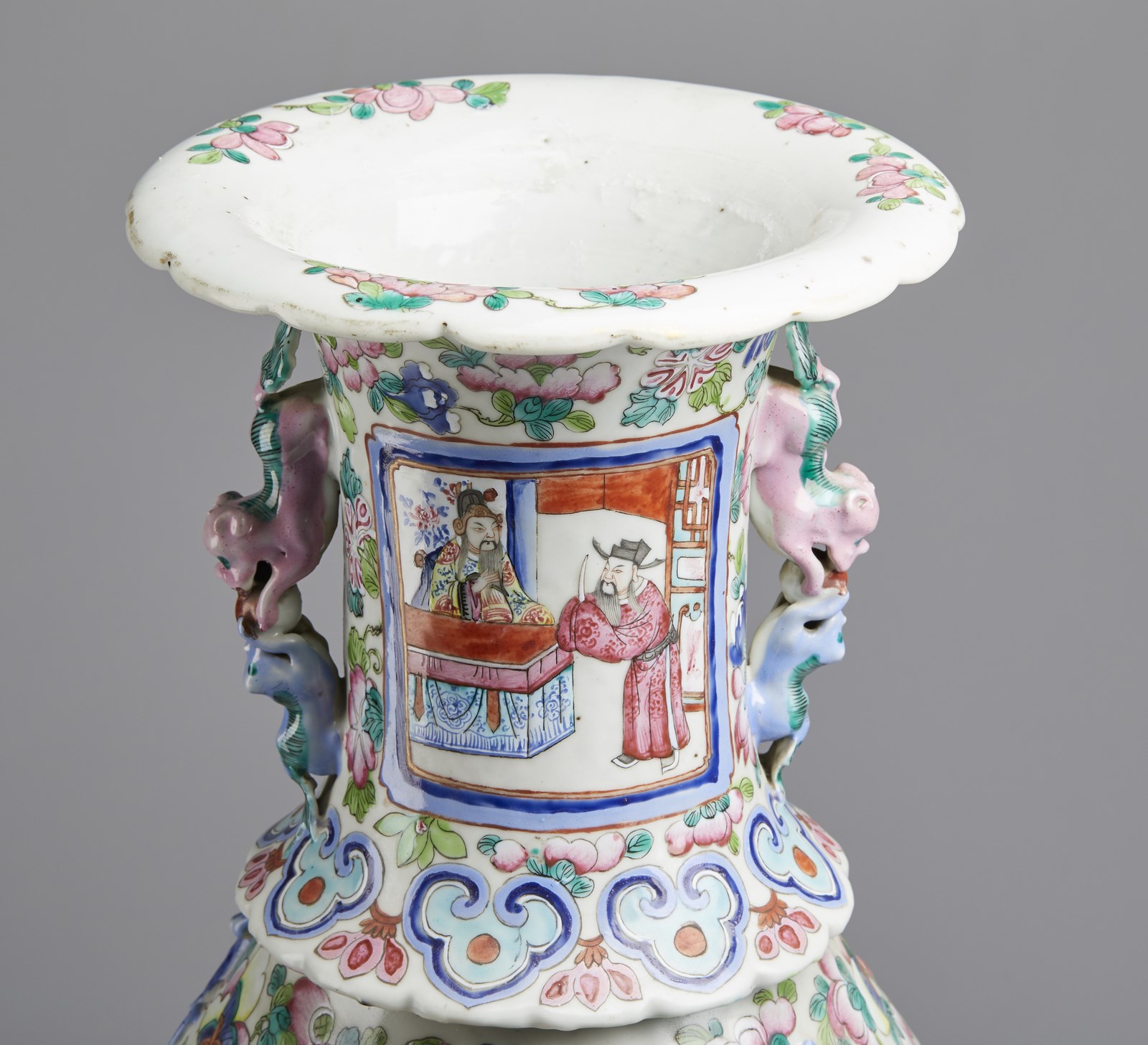 Un vaso a bottiglia in terracotta invetriata di verde e decorata in rilievo con dragoni (h. 35 cm) ed un vaso a balaustro in porcellana famiglia rosa Canton dipinto con scene cortesi.