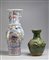 Un vaso a bottiglia in terracotta invetriata di verde e decorata in rilievo con dragoni (h. 35 cm) ed un vaso a balaustro in porcellana famiglia rosa Canton dipinto con scene cortesi.
