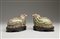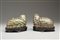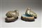 coppia di scatole a forma di quaglie policrome (h. 10 X 15,5 cm) con base in legno