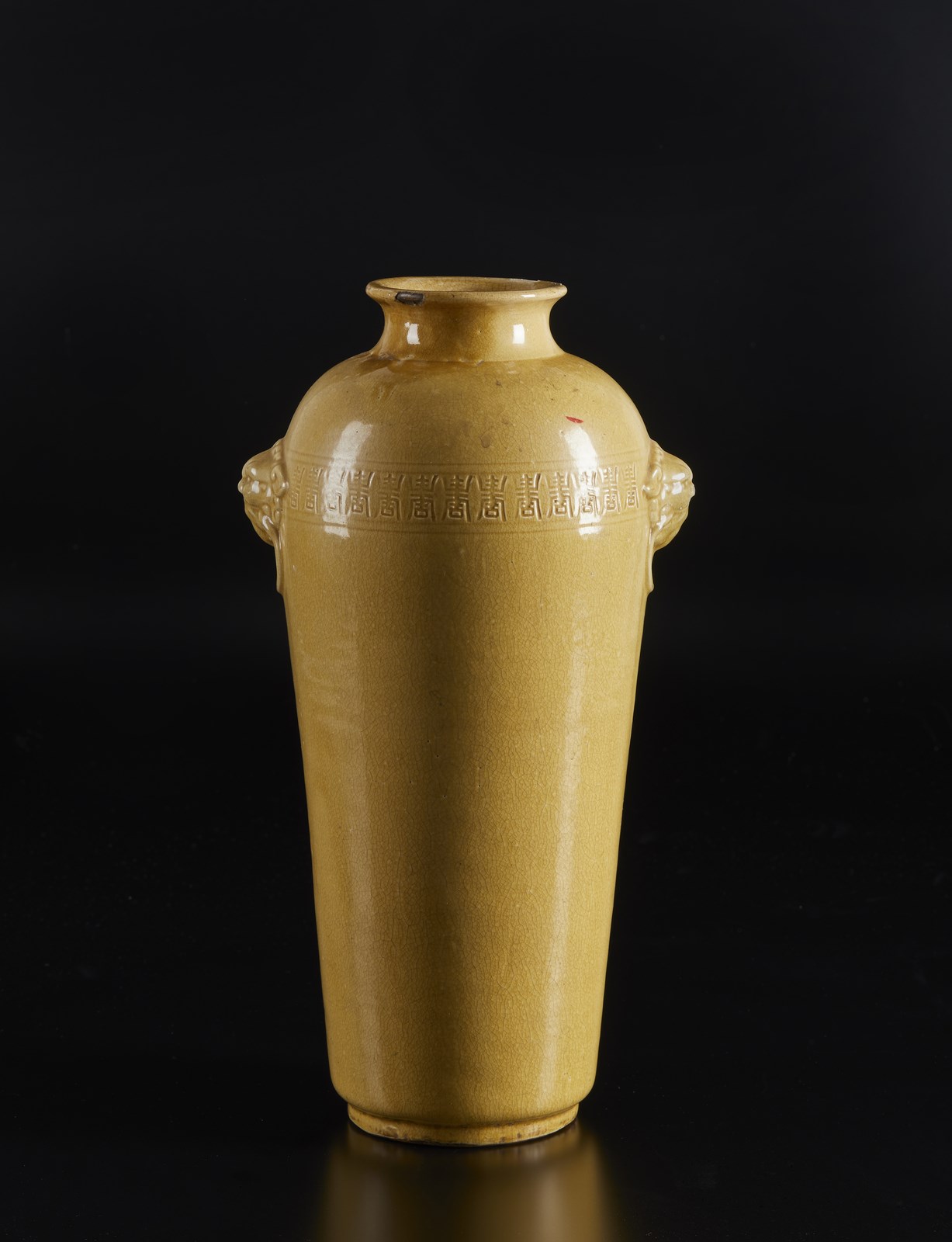 Cina, inizio XX secolo . . Cm 38,00. Vaso simile a un meiping con doppia ansa a protome leonina, ricoperto di invetriatura gialla e decorato con banda sgraffiata sulla spalla.