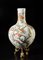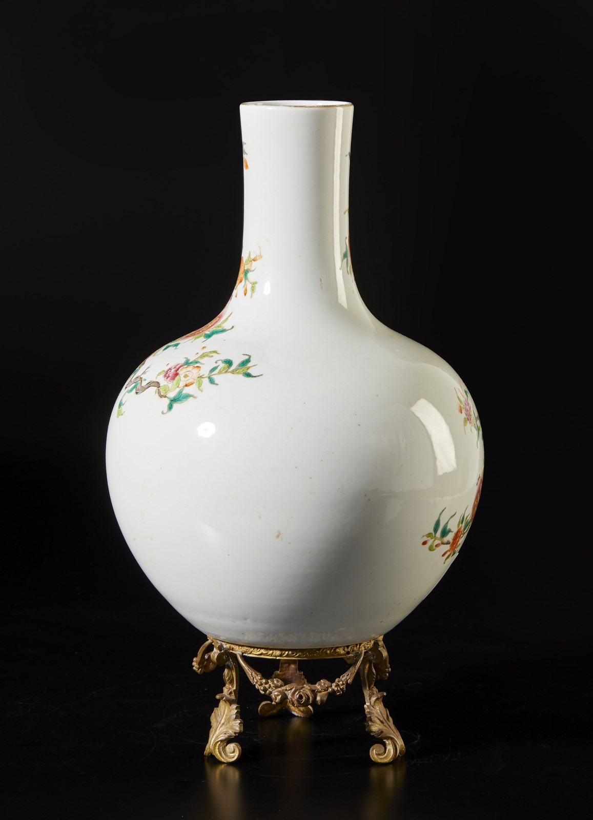 Cina, inizio XX secolo . . Cm 36,00. Vaso a bottiglia con ampio corpo globulare e alto collo cilindrico leggermente svasato. L'esterno dipinto in policromia con rami di pesco in fiore. Marchio apocrifo a sigillo Qianlong sulla base. Compleso di stand in metallo dorato (H. comprensiva di stand: 45 cm).