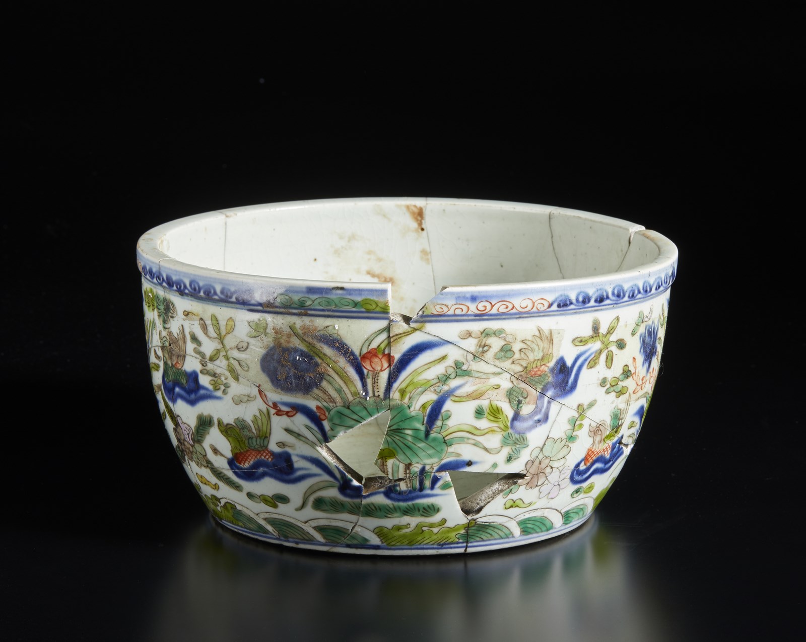 Cina, dinastia Ming, periodo Wanli. . Cm 29,00 x 14,80. Bacile in porcellana policroma wucai a corpo cilindrico leggermente svasato decorato con motivo di piante e fauna palustre. Contenitori di questa forma, usualmente indicati con il termine anglosassone di fish-tank, rappresentano un tipico accessorio degli eleganti arredi di epoca Ming dove venivano usati a scopo decorativo per accogliere i vistosi pesci rossi, cari alla tradizione cinese. In questo tipo di manufatti le pareti esterne sono spesso decorate con elementi desunti dalla osservazione della flora e della fauna palustre, rappresentati- specialmente in epoca tardo Ming- con tratto vivace e corsivo. Sulla parte alta, incluso in un semplice cartiglio, é visibile il marchio a sei caratteri di Wanli.