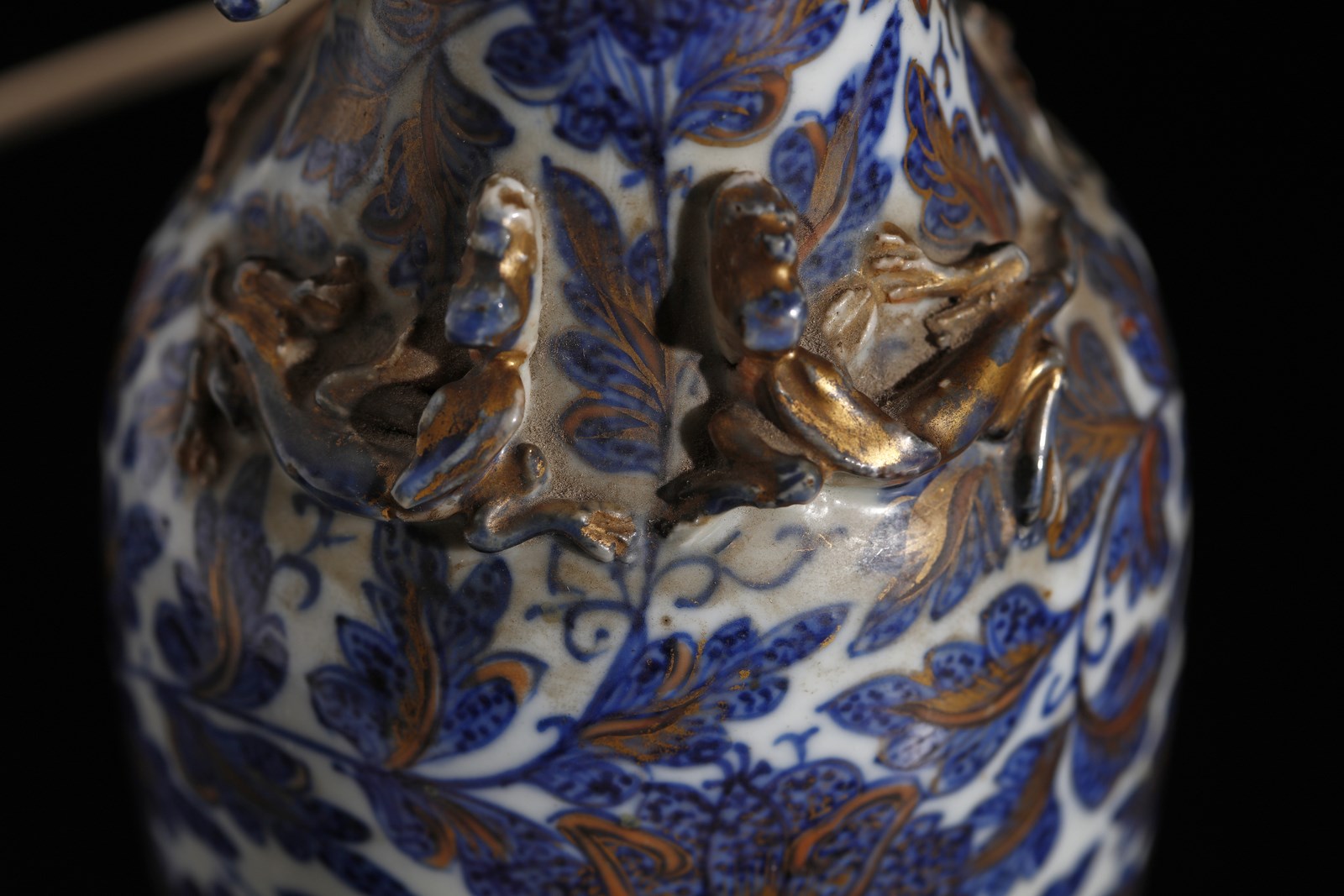 Cina, XIX secolo . . Cm 10,00 x 25,00 x 9,00. Vaso a balaustro in porcellana dipinta a decoro floreale in blu sottocoperta e tocchi di oro sopra vetrina.