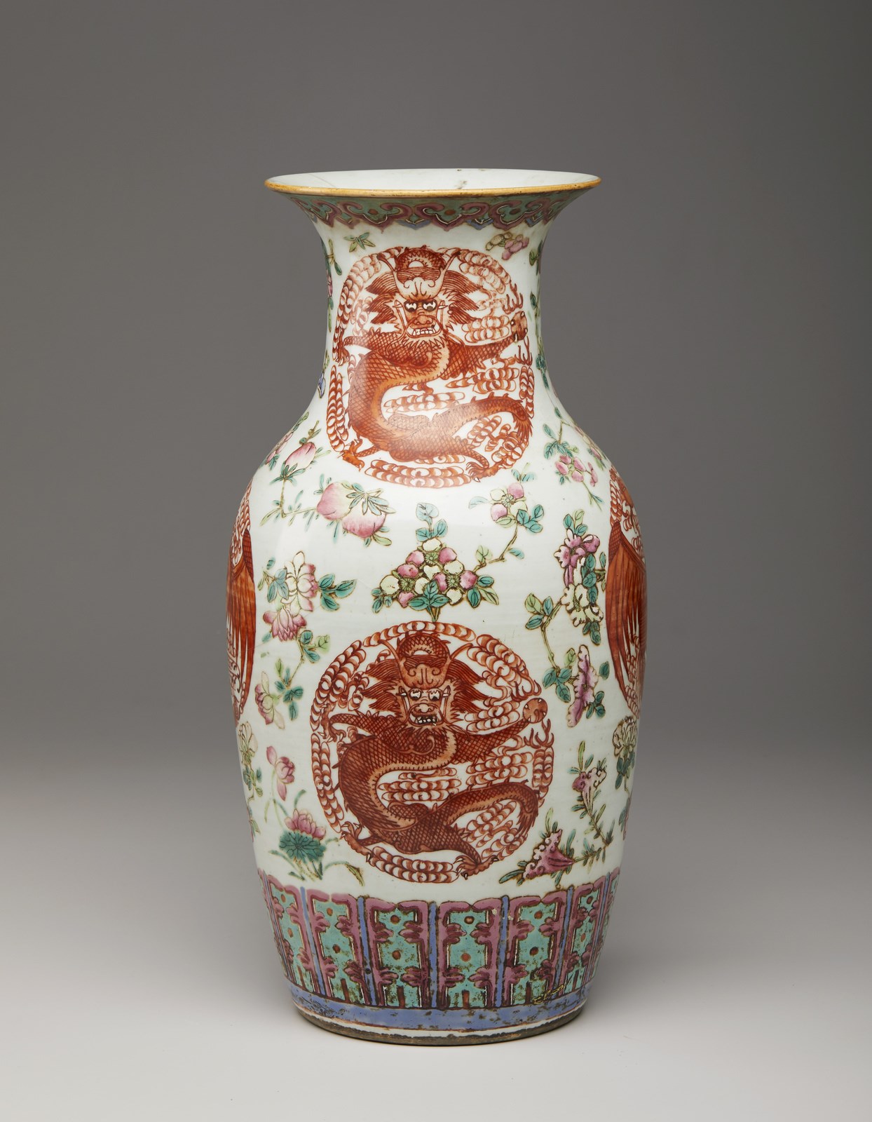 un vaso a balaustro decorato con dragoni in rosso sovracoperta;