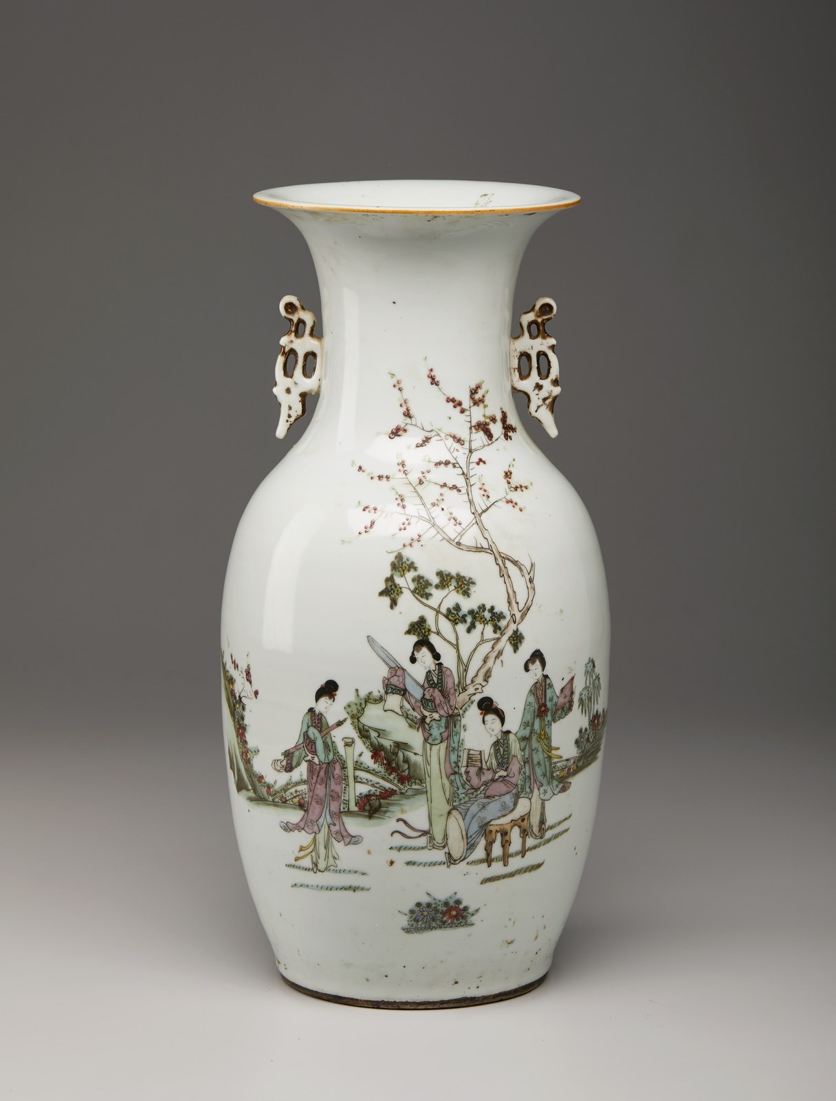 Un vaso a balaustro famiglia rosa decorato con scena cortese di dame in esterno;