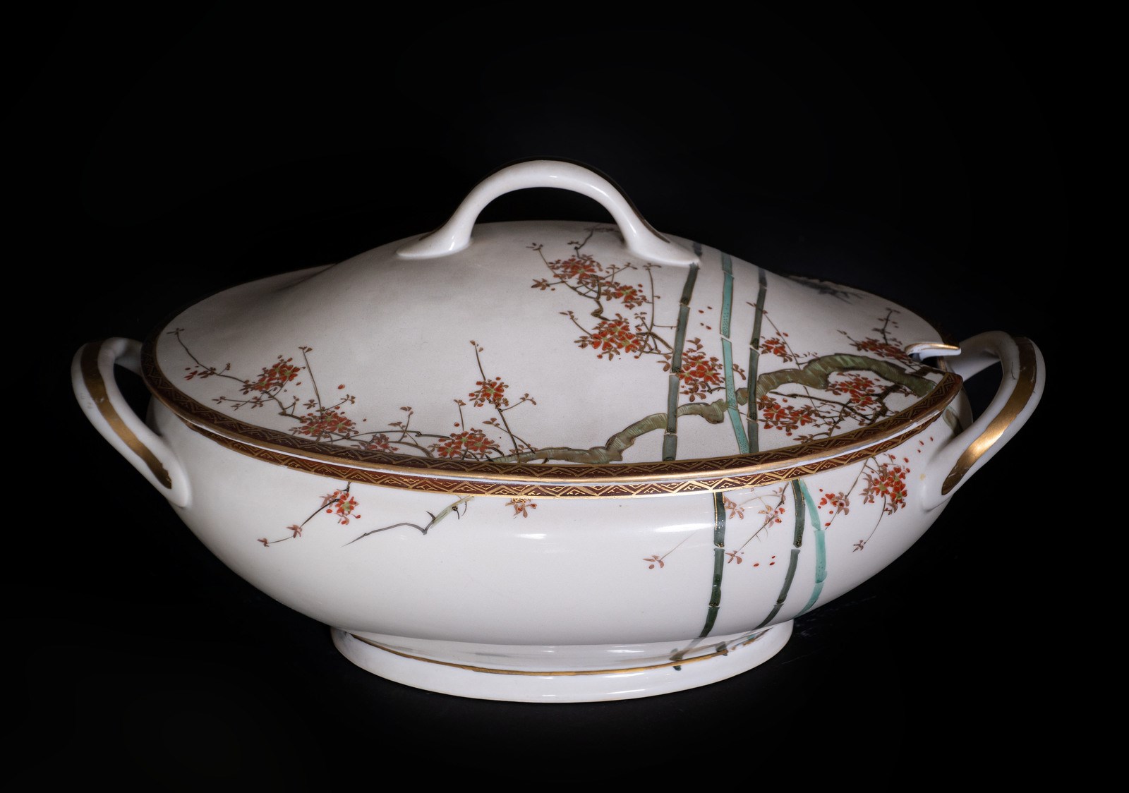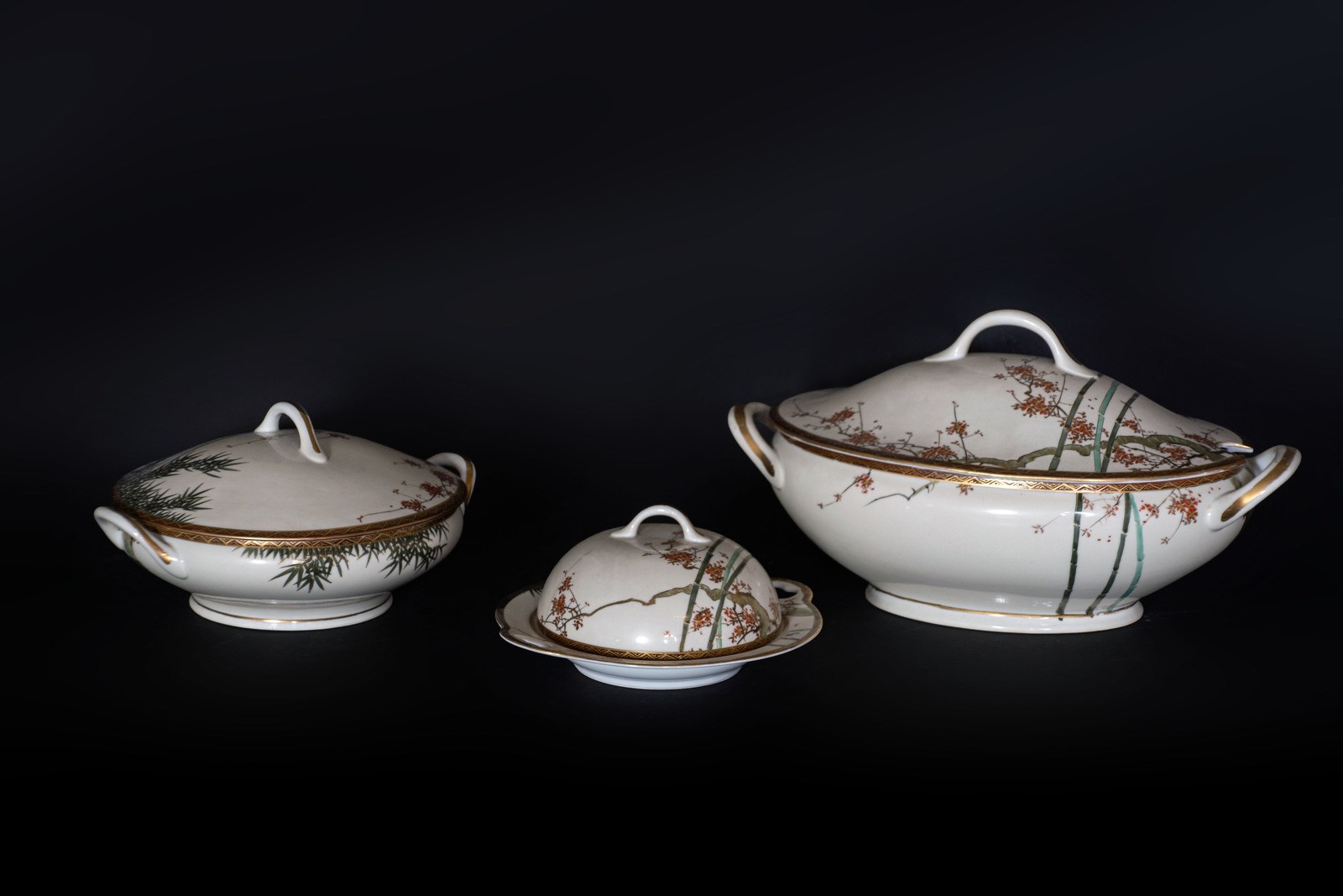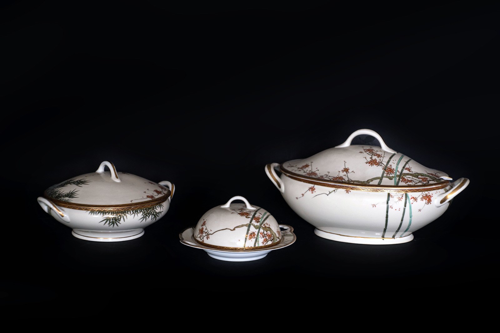 Giappone, XIX secolo . . . Lotto composto da due zuppiere ed uno scaldavivande in porcellana bianca (forse Arita) con decoro a foglie di bambù e fiori con lumeggiature in oro.