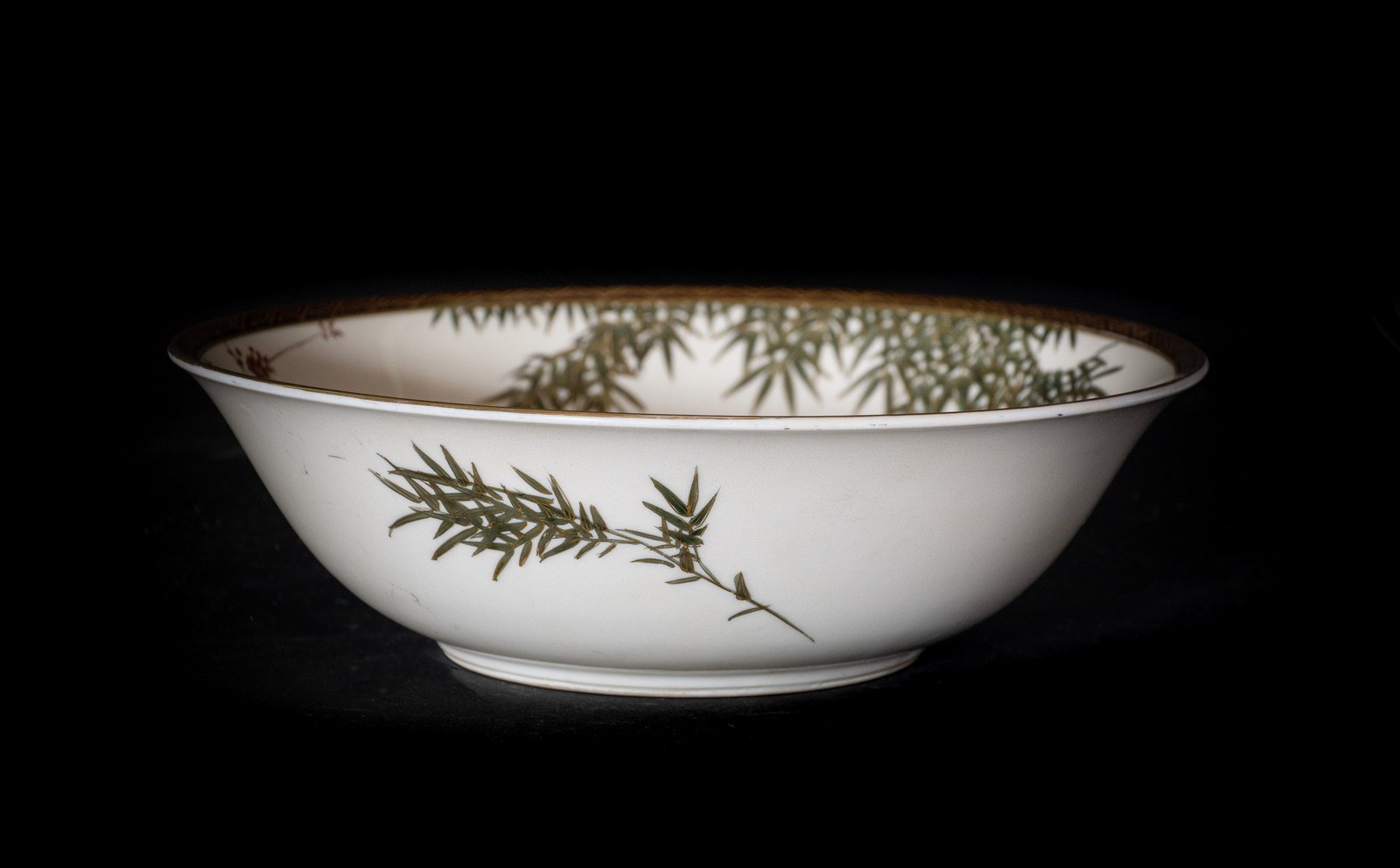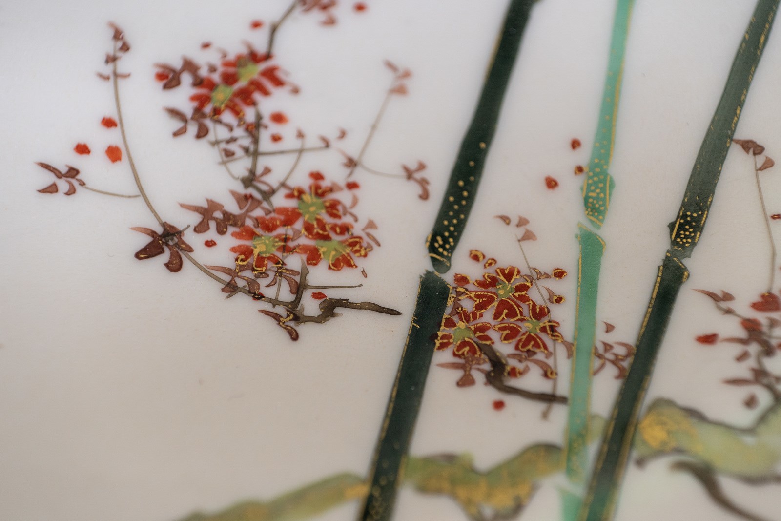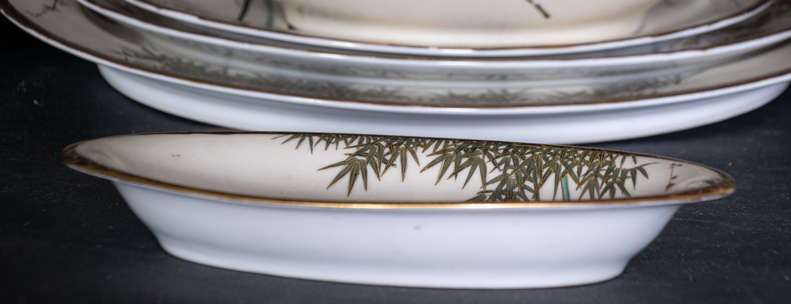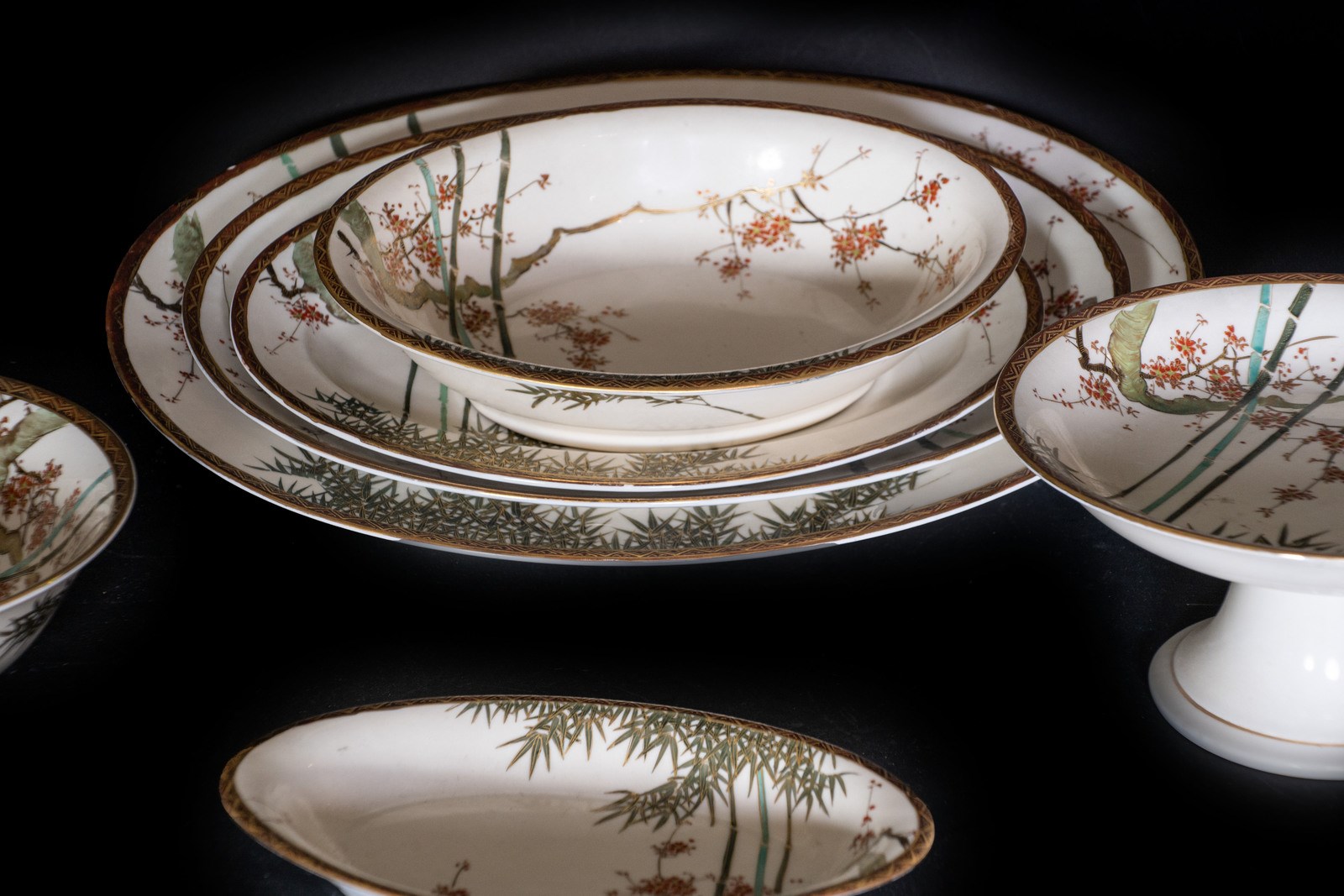 Giappone, XIX secolo . . . Include: una ciotola ovale, una ciotola tonda, una alzata tonda, quattro vassoi ovali di misure digradanti in porcellana bianca (forse Arita) con decoro a foglie di bambù e fiori con lumeggiature in oro.