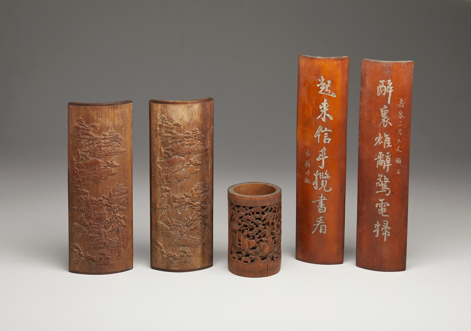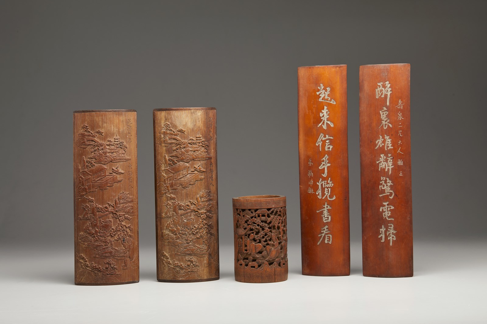 Arte Cinese - Set da calligrafo composto da quattro poggiabraccia ed un portapennelli (bitong) in bamboo Cina, dinastia Qing, XIX secolo .