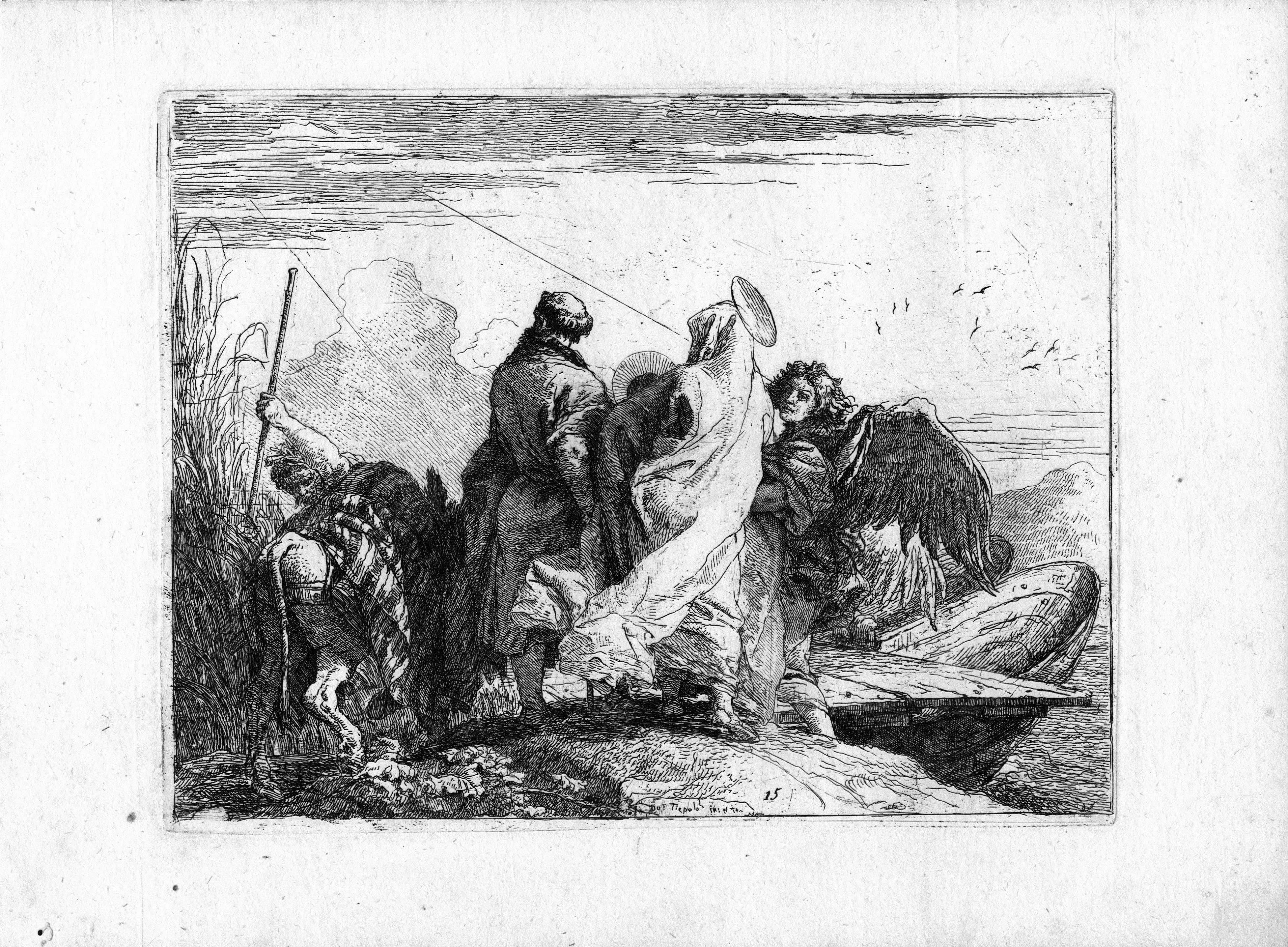 Firmata in basso sulla lastra. Quindicesima tavola da Idee pittoresche sopra la fuga in Egitto, serie di 27 tavole (incluso il frontespizio, un titolo e la dedica) pubblicate a Wurzburg nel 1753 e dedicata al Principe Carlo Filippo di Greinffenklau. II stato su 2 dopo la numerazione.