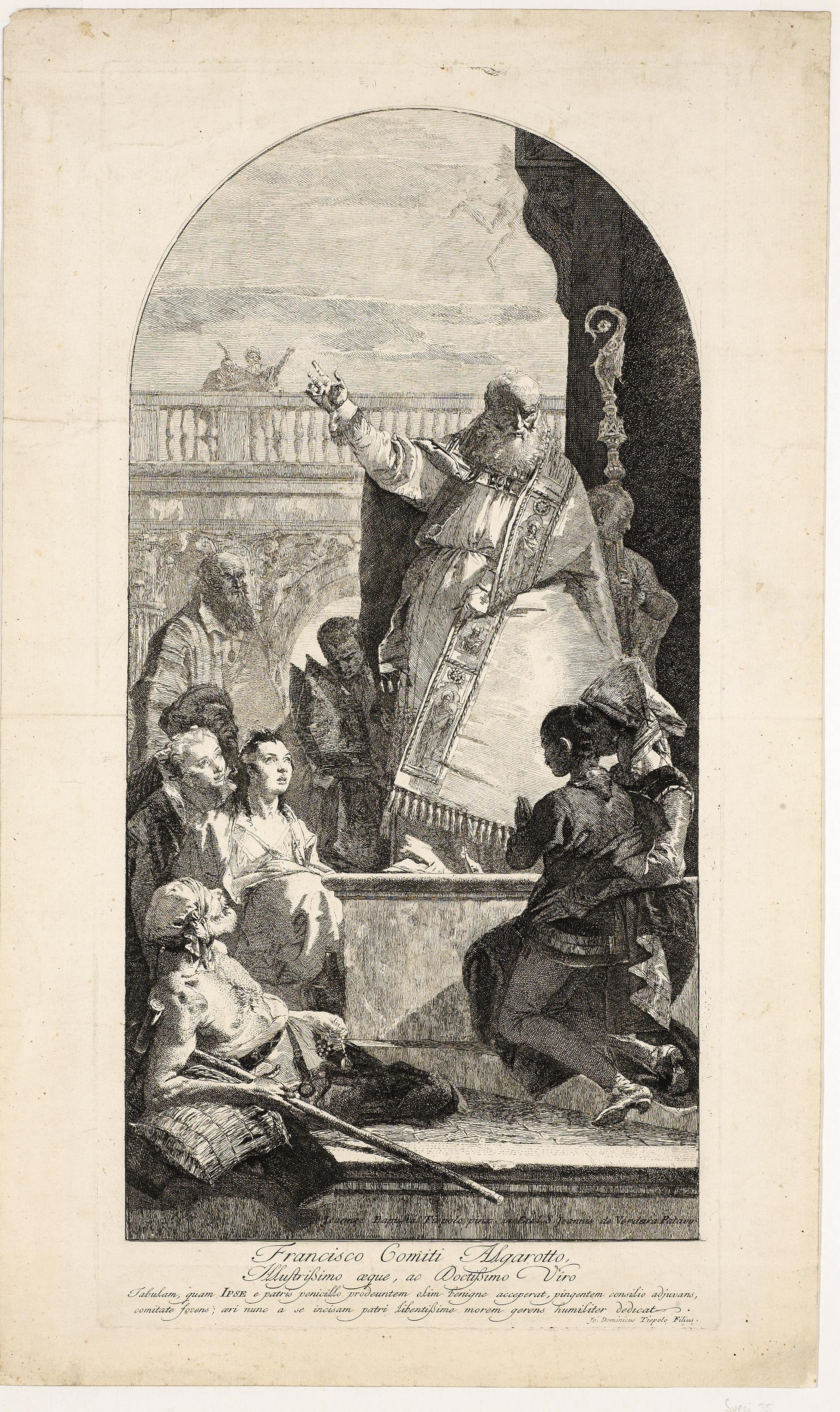 Firmata sulla lastra in basso a destra. Dedicata a Francesco Algarotti, l’incisione replica un dipinto di Giambattista per il Monastero dei Gesuiti di Padova. I stato su 3.