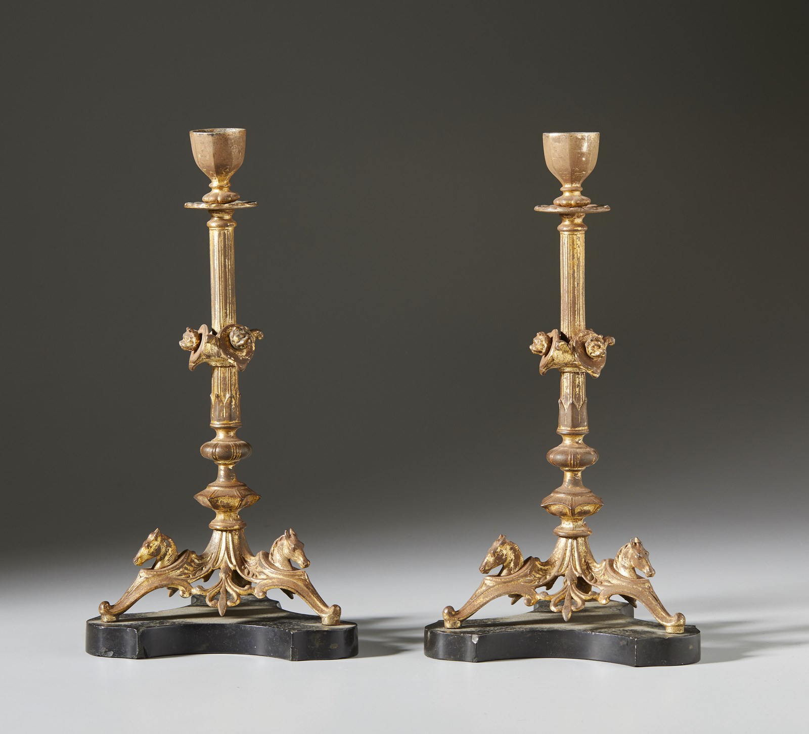 . Coppia di candelieri in bronzo. . Cm 14,00 x 29,50. Due candelieri in bronzo dorato realizzati nello stile eclettico in voga nei primi anni del XX secol e caratterizzati da motivi decorativi zoomorfi