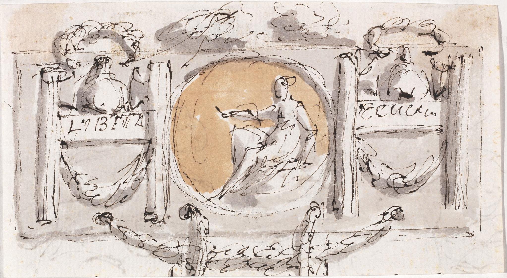Penna e inchiostro nero e acquerelo grigio e bruno su carta vergellata. mm 76x139.