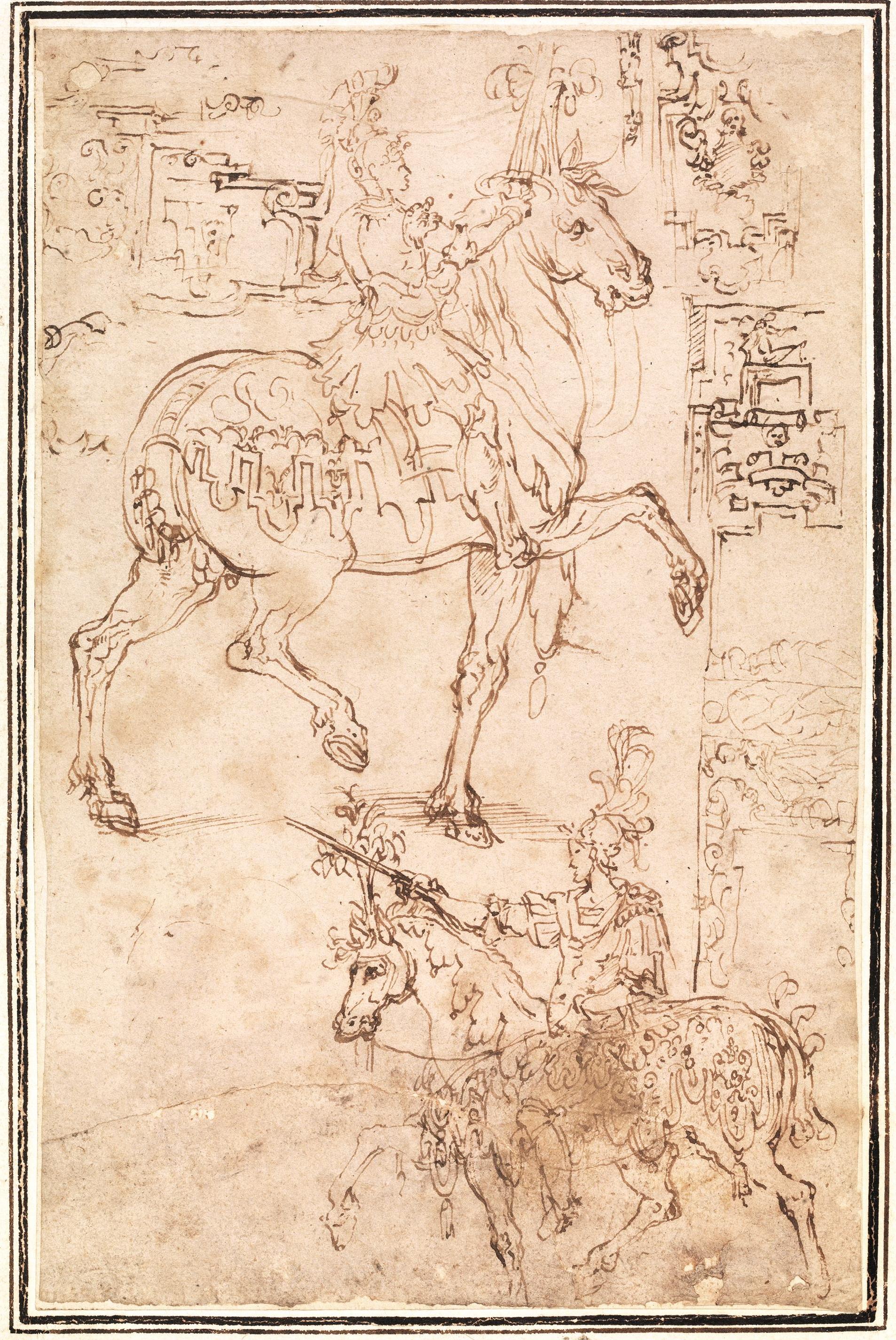 BOZZETTO PER APPARATO SCENOGRAFICO CON FIGURE EQUESTRI E FREGI