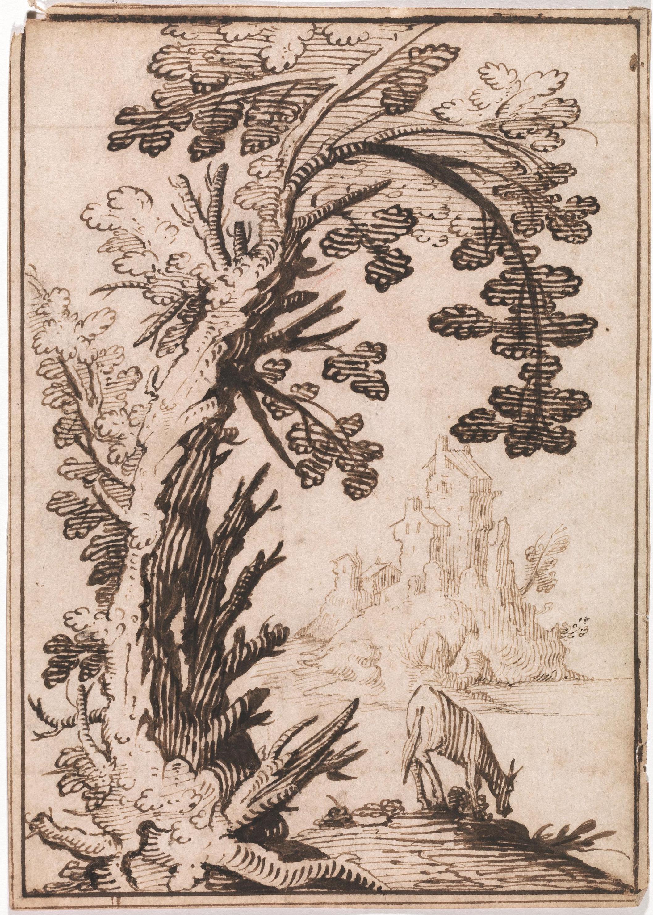 Penna e inchiostro bruno, riquadrato due volte a penna su carta vergellata con parte di filigrana non identificabile. mm 195x139.