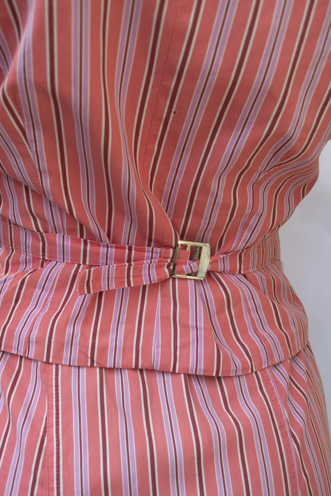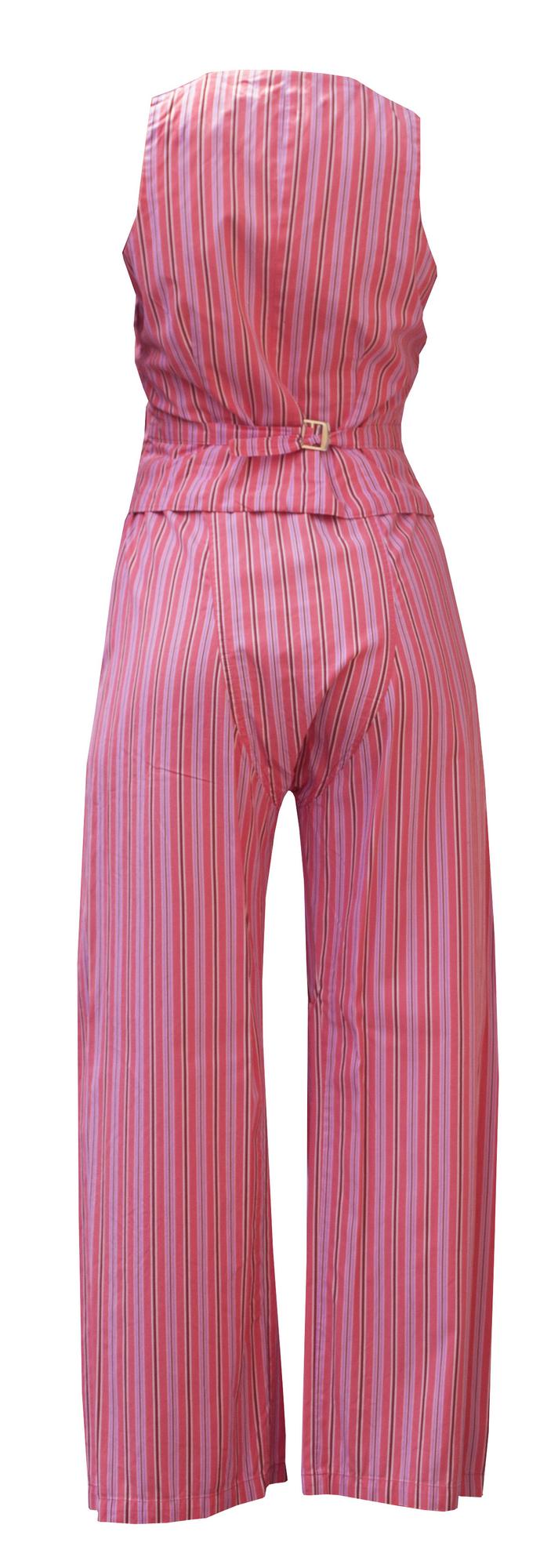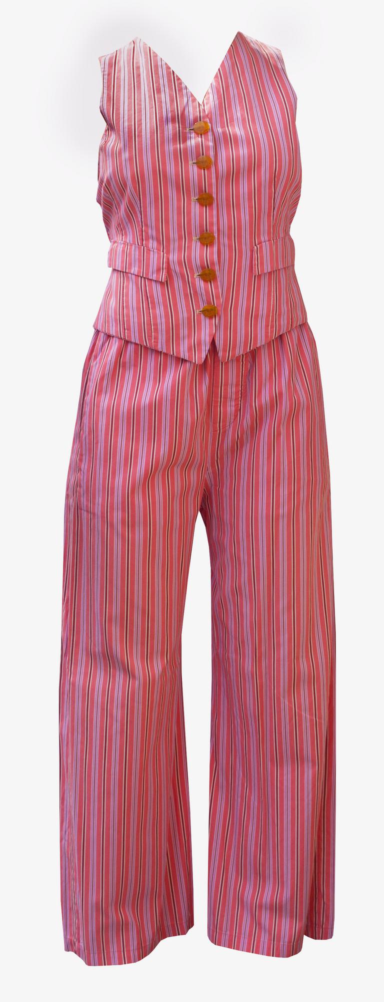 Striped cotton pajama suit. Pink background alternated with burgundy and lilac lines. the suit consists of trousers and a waistcoat. Made in England in the early 90s. Trouser size Small. Waistcoat size UK size10. Well preserved.