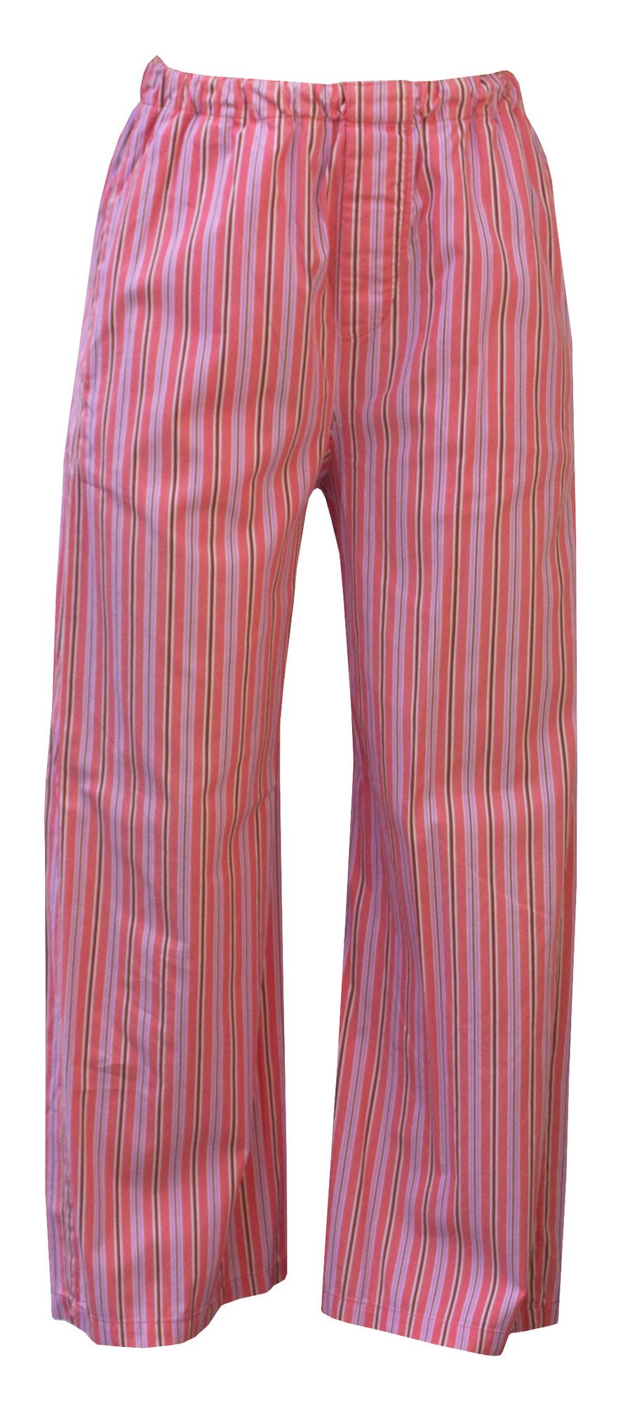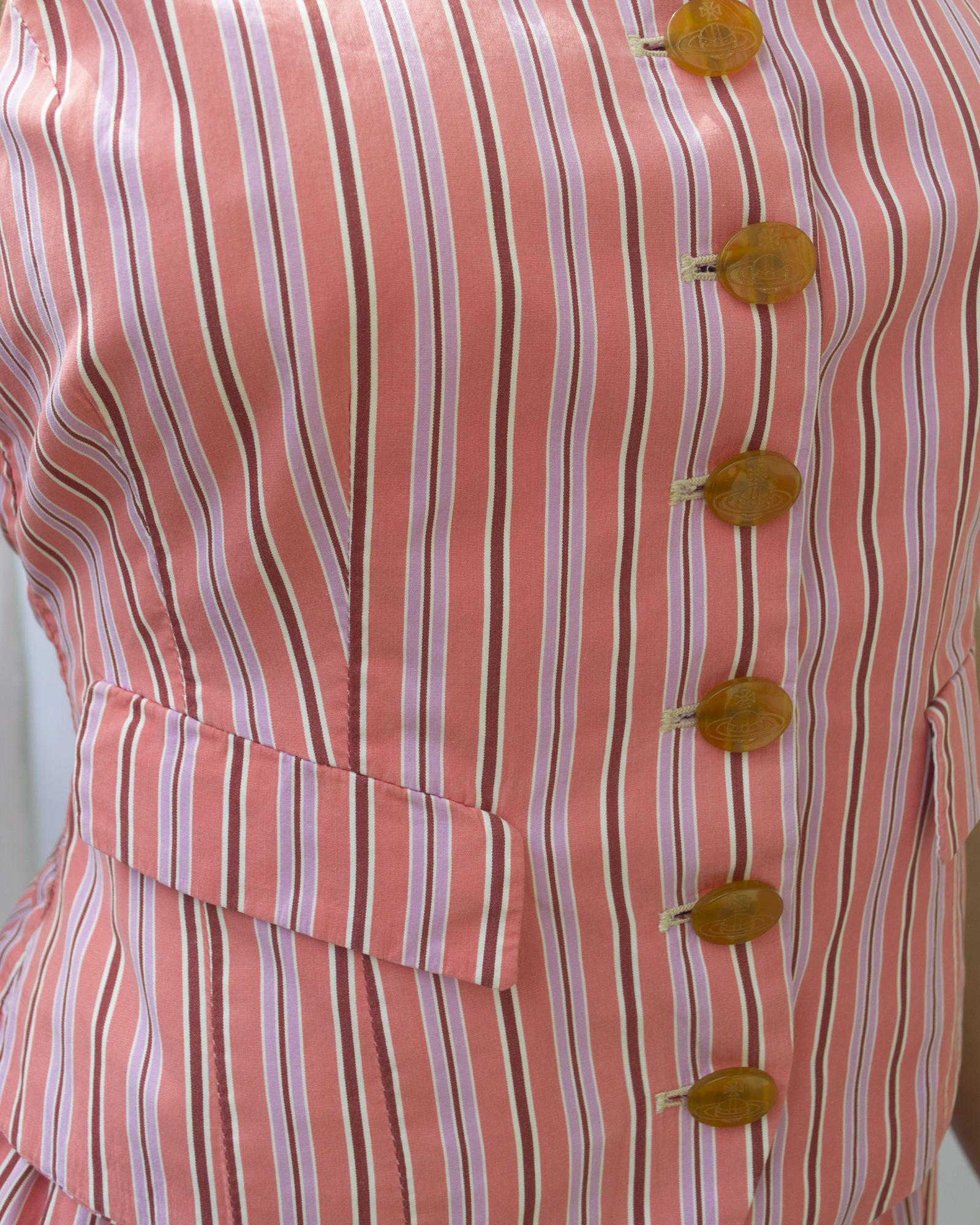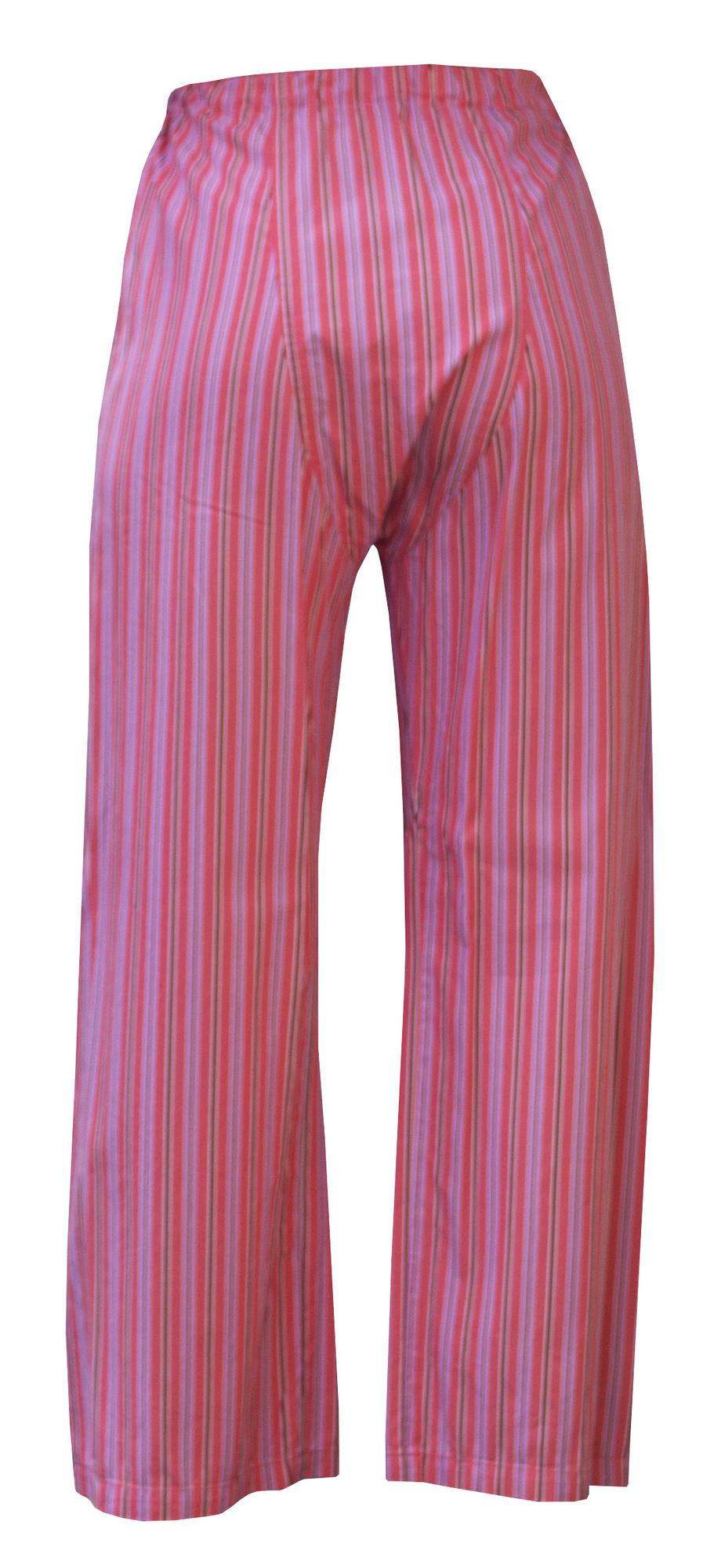 Striped cotton pajama suit. Pink background alternated with burgundy and lilac lines. the suit consists of trousers and a waistcoat. Made in England in the early 90s. Trouser size Small. Waistcoat size UK size10. Well preserved.