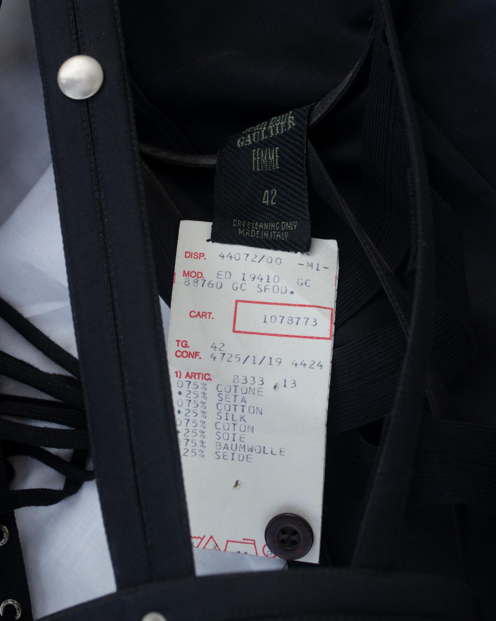 Iconica e esclusiva, giacca a gabbia doppiopetto, realizzata in taffeta' di cotone e seta, la struttura e' fatta di stecche. Capo di interesse per collezionisti. Parte della collezione realizzata per il Blonde Ambition Tour di Madonna. 1990. Made in Italy, taglia IT 42. Eccellente stato.