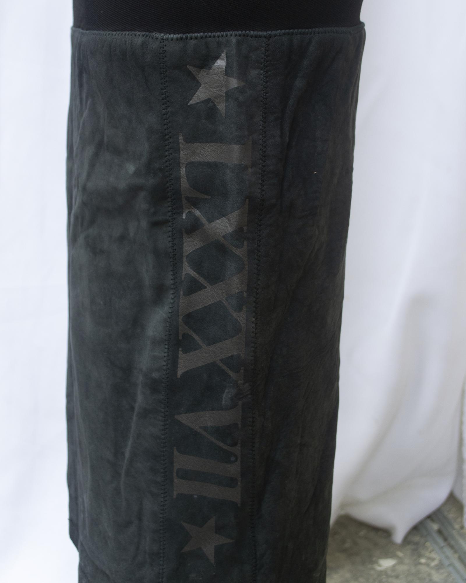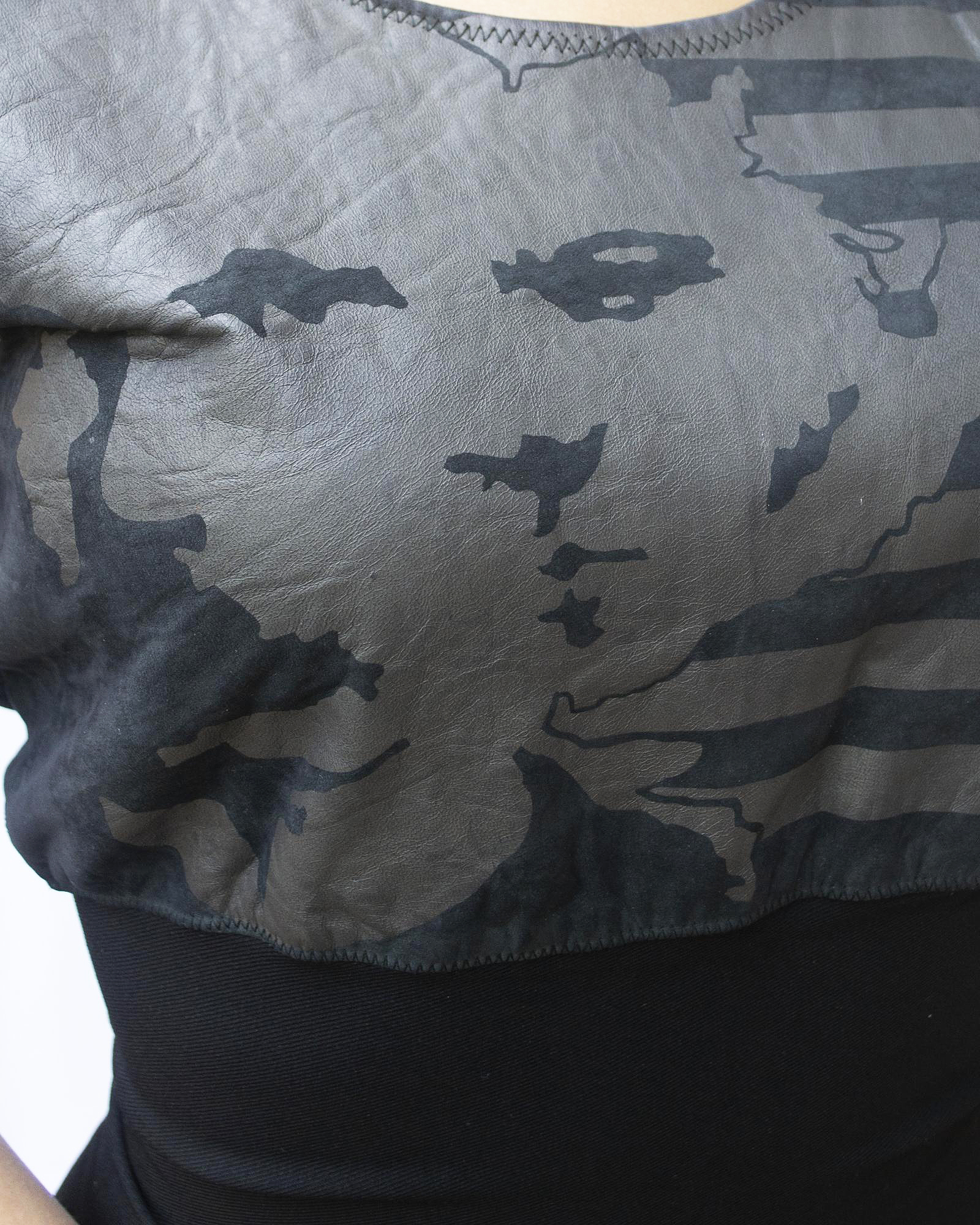 A stretch jersey fabric is the central part of a dress that has a tone-on-tone printed leather top and skirt. Made in Italy by Ghezzi in 1987 as the print shows on the side of the skirt. Rare iconic garment. Size IT 42. Perfectly preserved.
