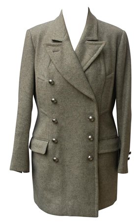 Caban doppiopetto in Harris Tweed grigio chiaro melange, fodera corpo in grigio scuro, fodera maniche in disegno gessato.Tasca laterale a filetto sul busto e tasche con patta sui fianchi. Bottoni in metallo ottone rifiniti in argento. Realizzato negli anni '80. Taglia IT 42. Made in Italy. Perfettamente conservato.