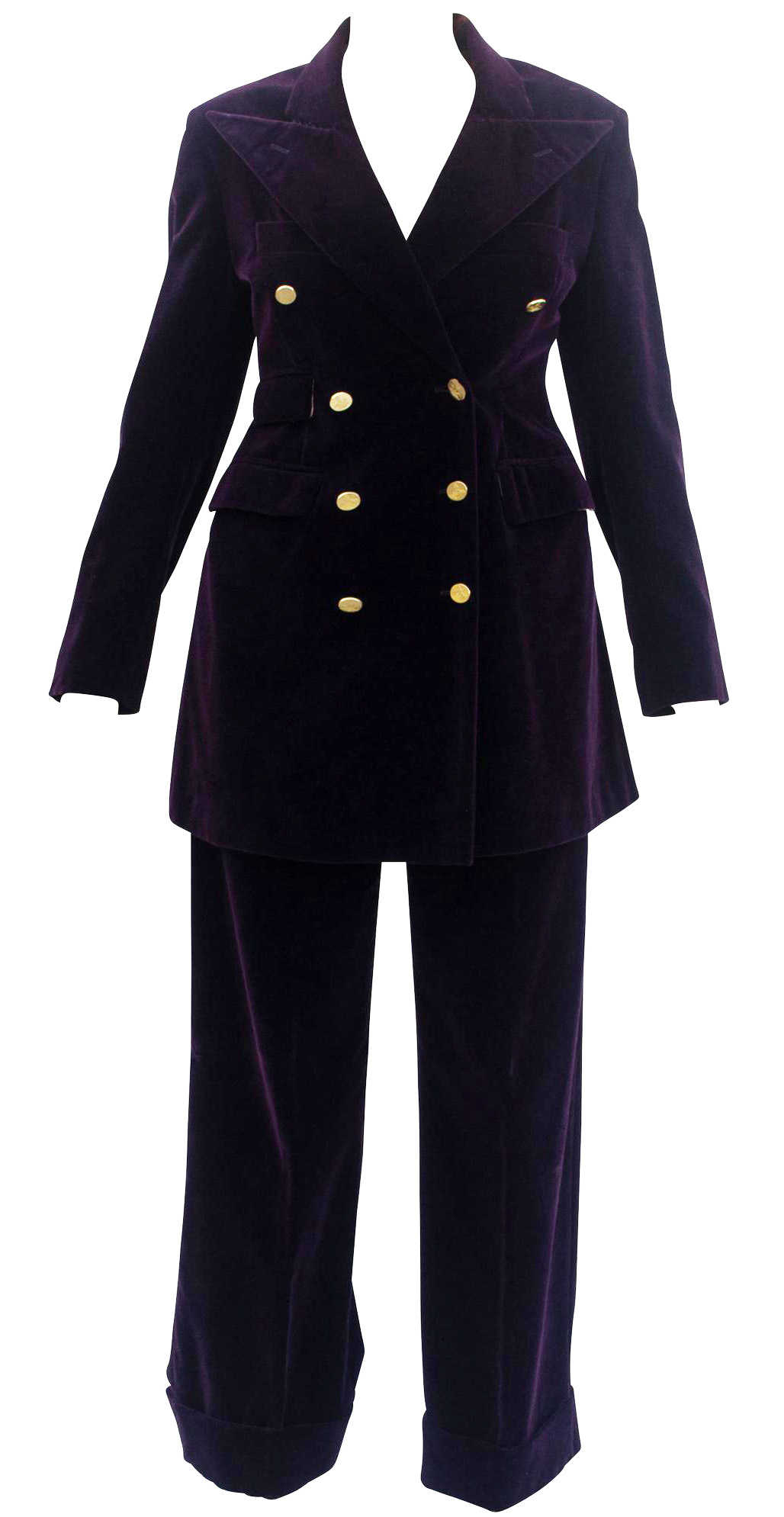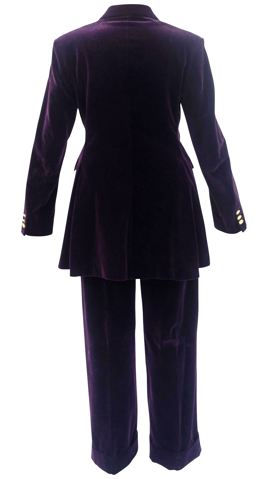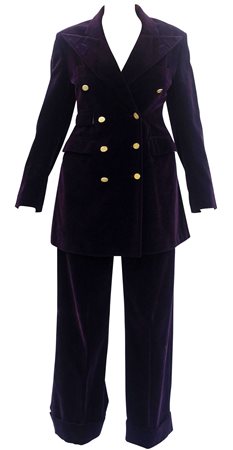 Abito in velluto di cotone colore viola, composto da una giacca doppiopetto foderata e pantalone palazzo con ampio risvolto. Bottoni classici in ottone dorato con Orb logo. Prodotto in Italia negli anni '80.Taglia IT 42. Perfettamente conservato.