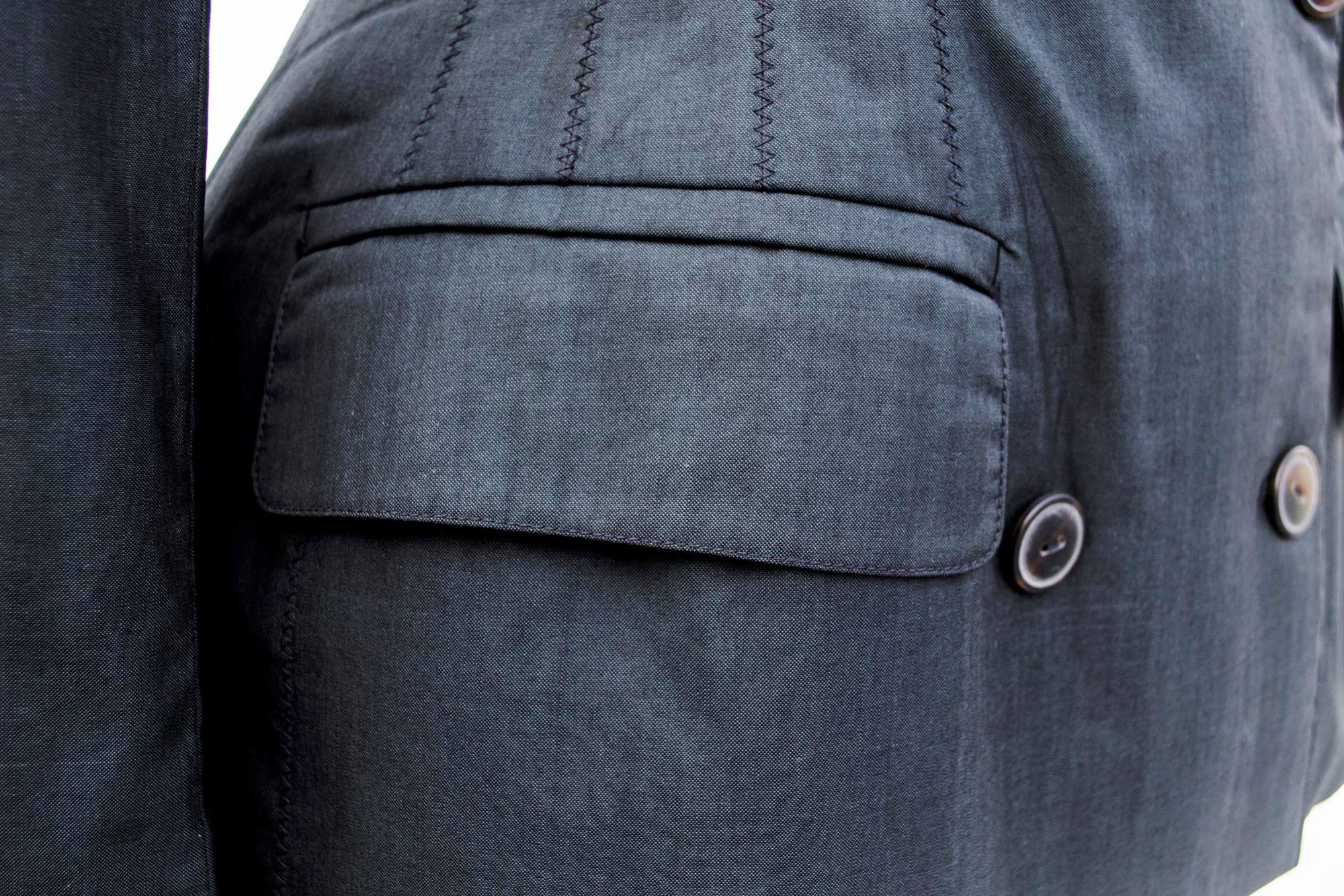 Descrizione:Giacca doppiopetto in cotone e seta blu cangiante. Foderata in twill nero, leggera imbottitura sui fianchi per dare la forma iconica, dettagli sartoriali, spalline. Tasche con patta. Prodotto in Italia negli anni '80. Taglia IT 42. Perfettamente conservata.