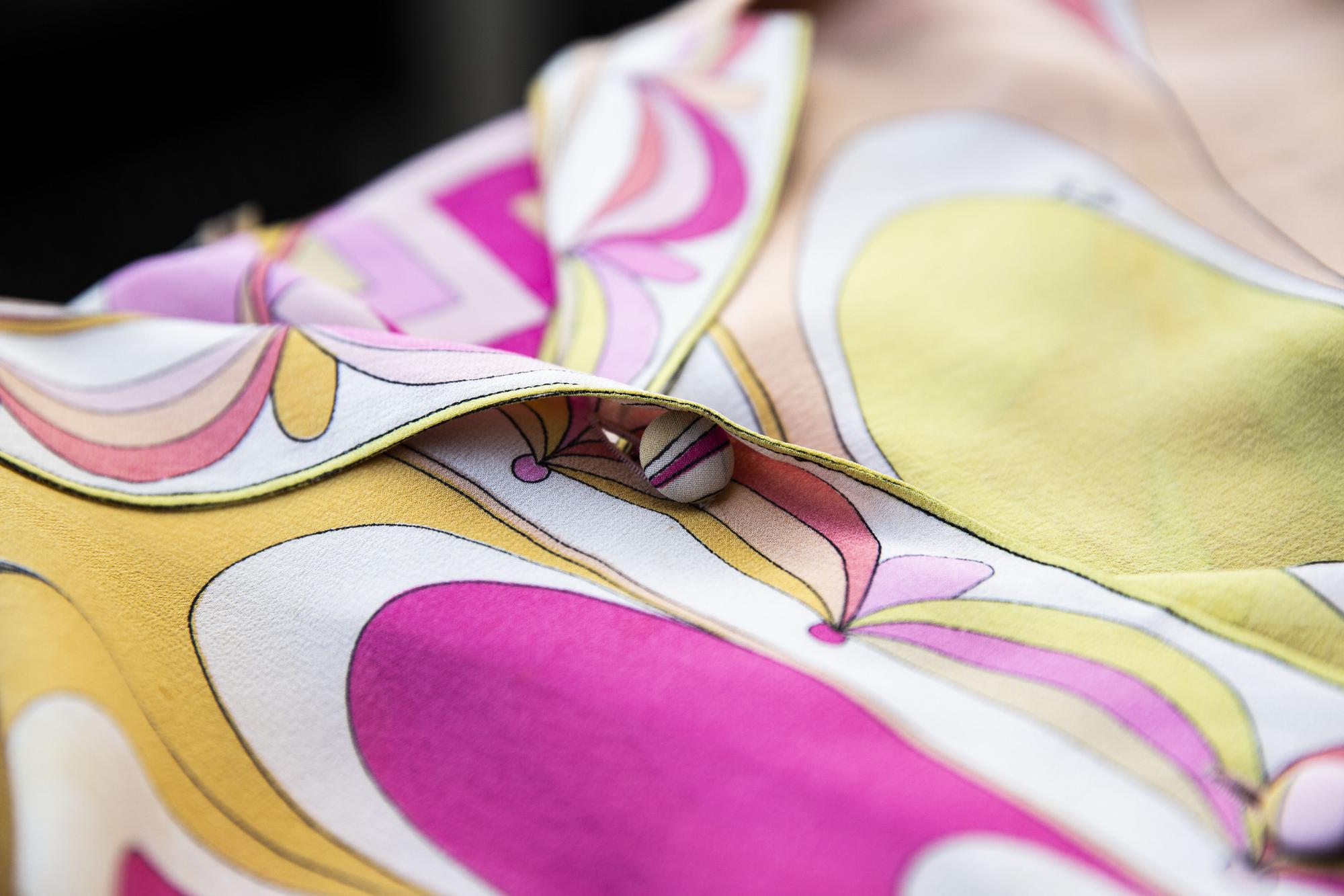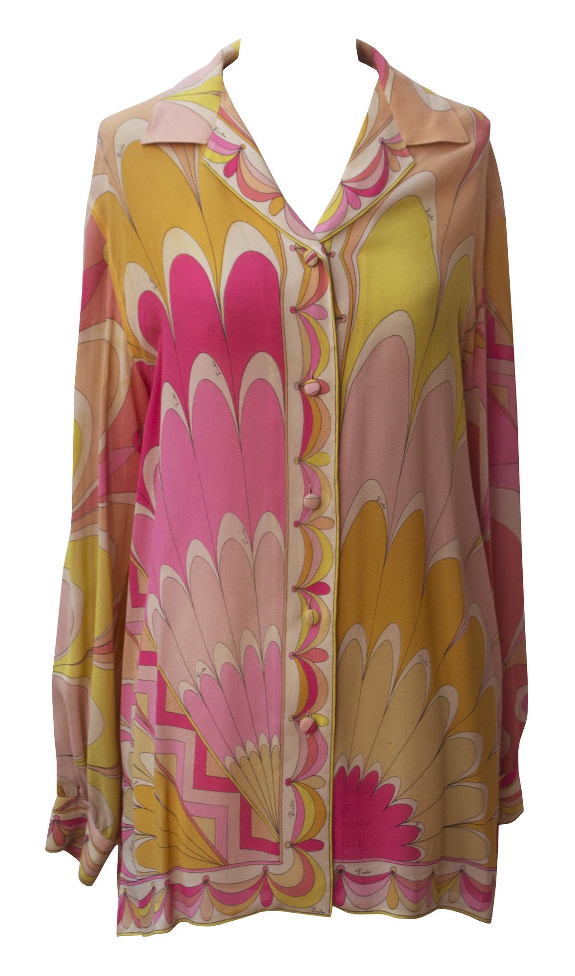 Georgette di seta stampata per questa camicia a maniche lunghe. Colori dai toni rosa al giallo. Bottoni ricoperti in tessuto. Prodotto a Firenze per Bergdorf Goodman negli anni '60, Taglia IT 42. Ben conservato.