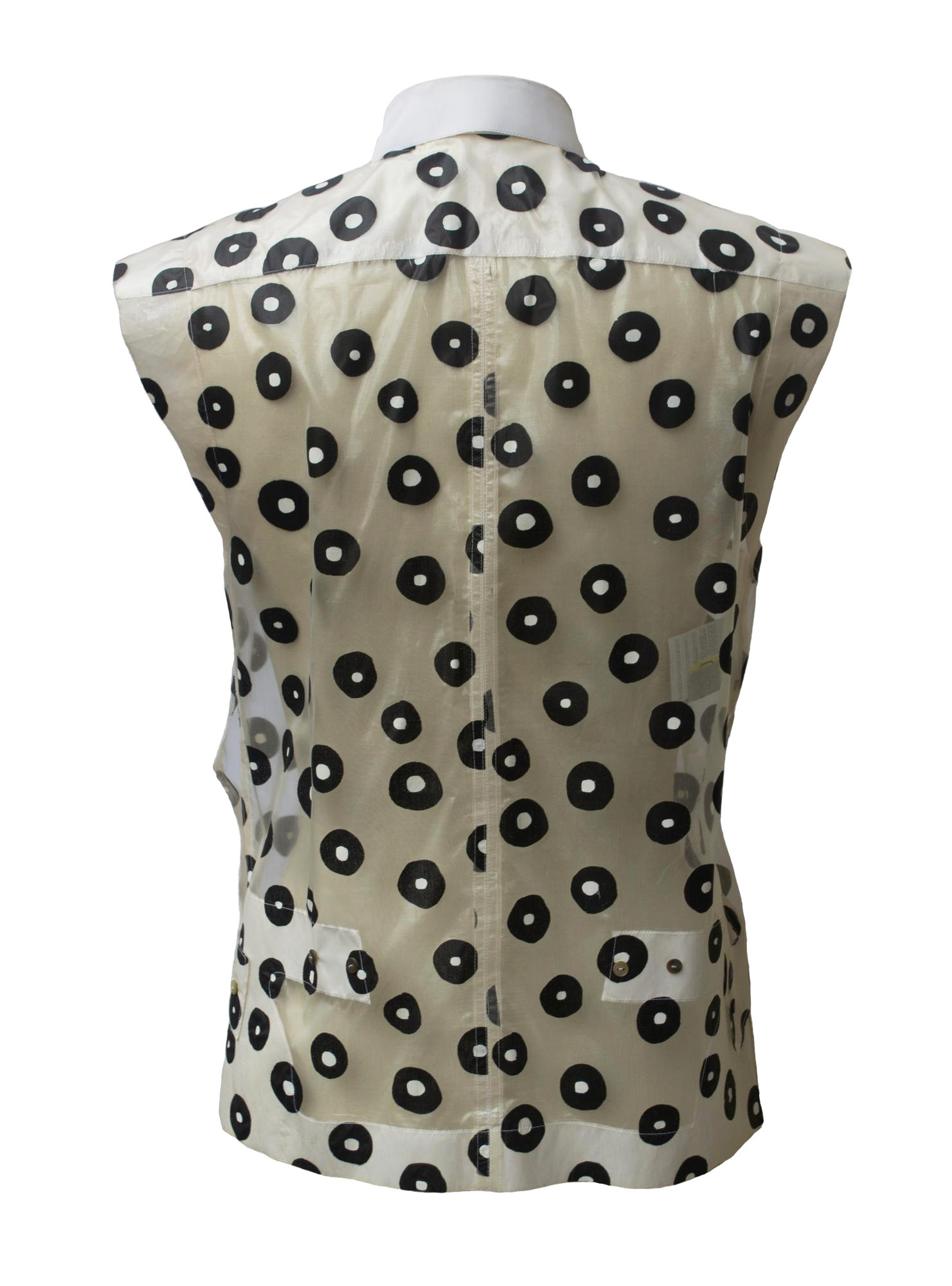 Poliestere e seta e colletto e lista in poliuretano per questa camicia tecno sartoriale completamente termo saldata. Made in Italy. FR size 38. Primi anni 2000. Ben conservata.