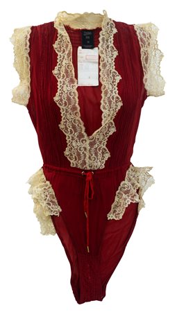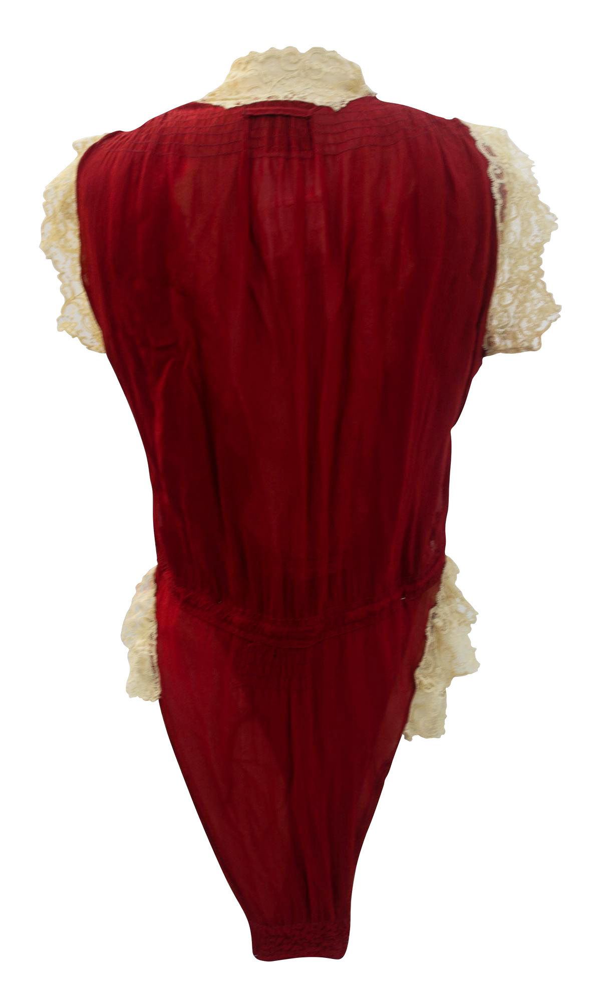 Body in georgette di rayon rosso porpora rifinito con pizzo valenciennes color ecru', scollo profondo, coulisse in vita. Made in Italy negli anni '80. Taglia IT 42. Perfettamente conservato.