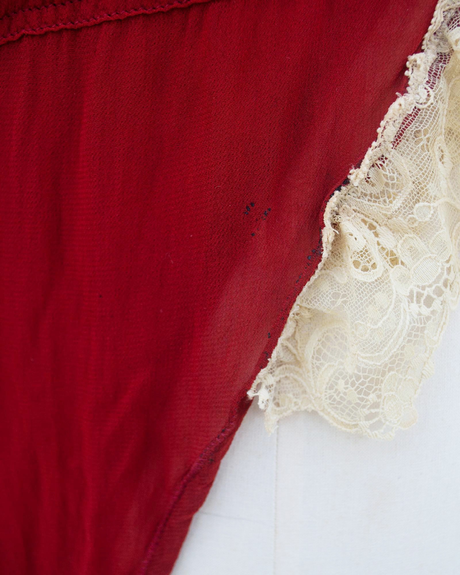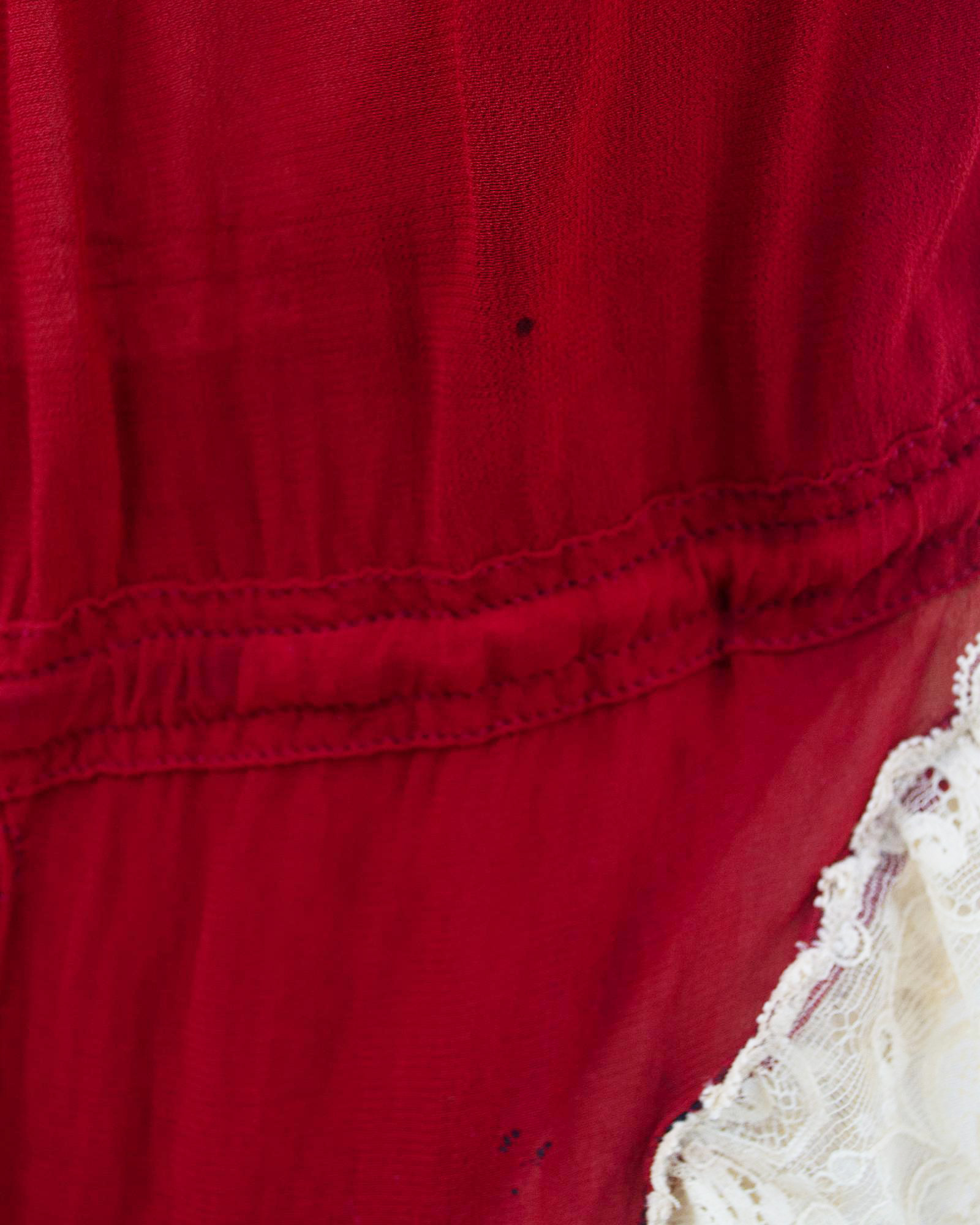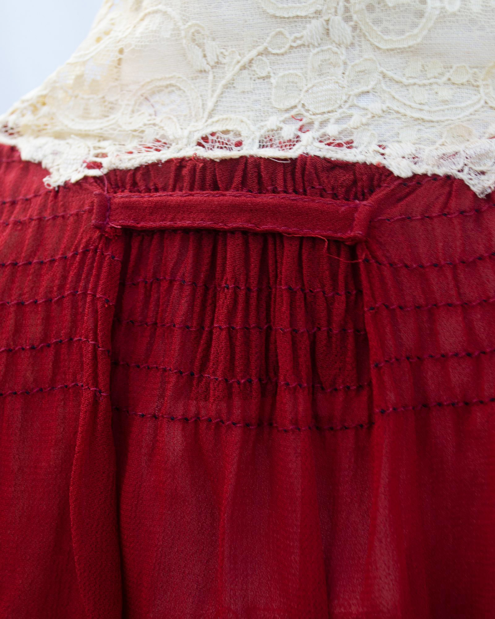 Purple red rayon georgette body trimmed with valenciennes lace in ecru' color, plunging neckline, drawstring at the waist. Made in Italy in the '80s. Size IT 42. Perfectly preserved.