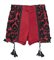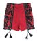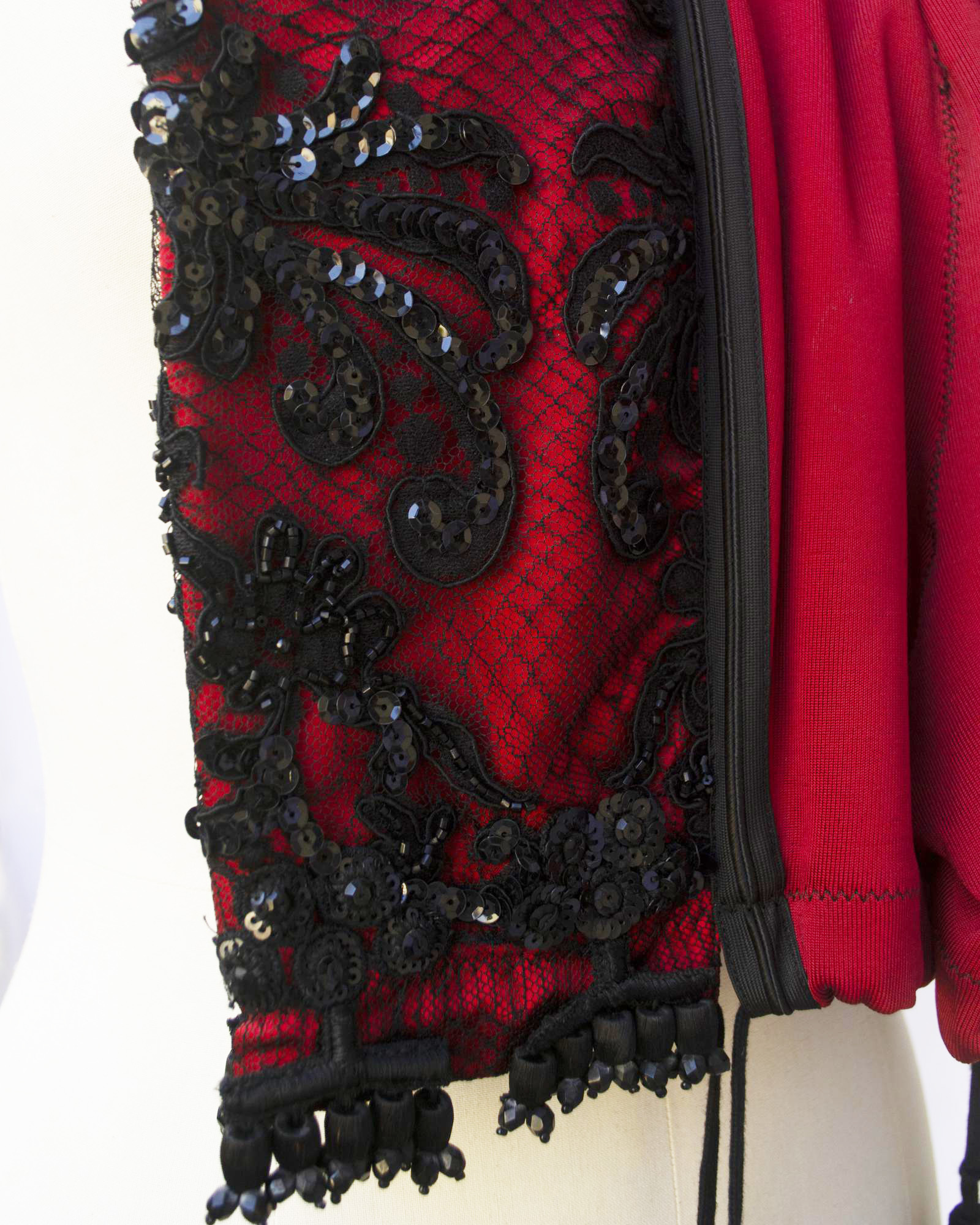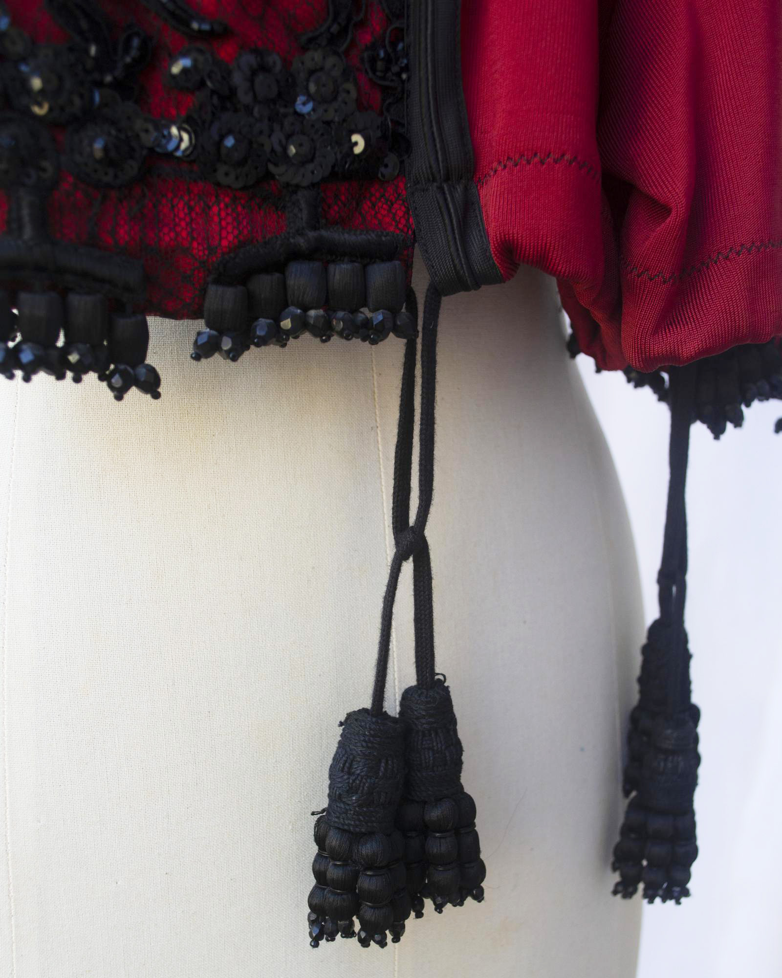 Shorts in tessuto elastico rosso con applicazioni di pizzo nero ricamato con paillettes di vario tipo e dimensione, fondo con applicazione di passamaneria a nappine nere. Allacciatura centrale dietro con zip invisibile e gancio. Prodotto in Italia nel 1988. Taglia IT 42. Mai indossato. Modello raro. Fatto in Italia. Eccellente stato.