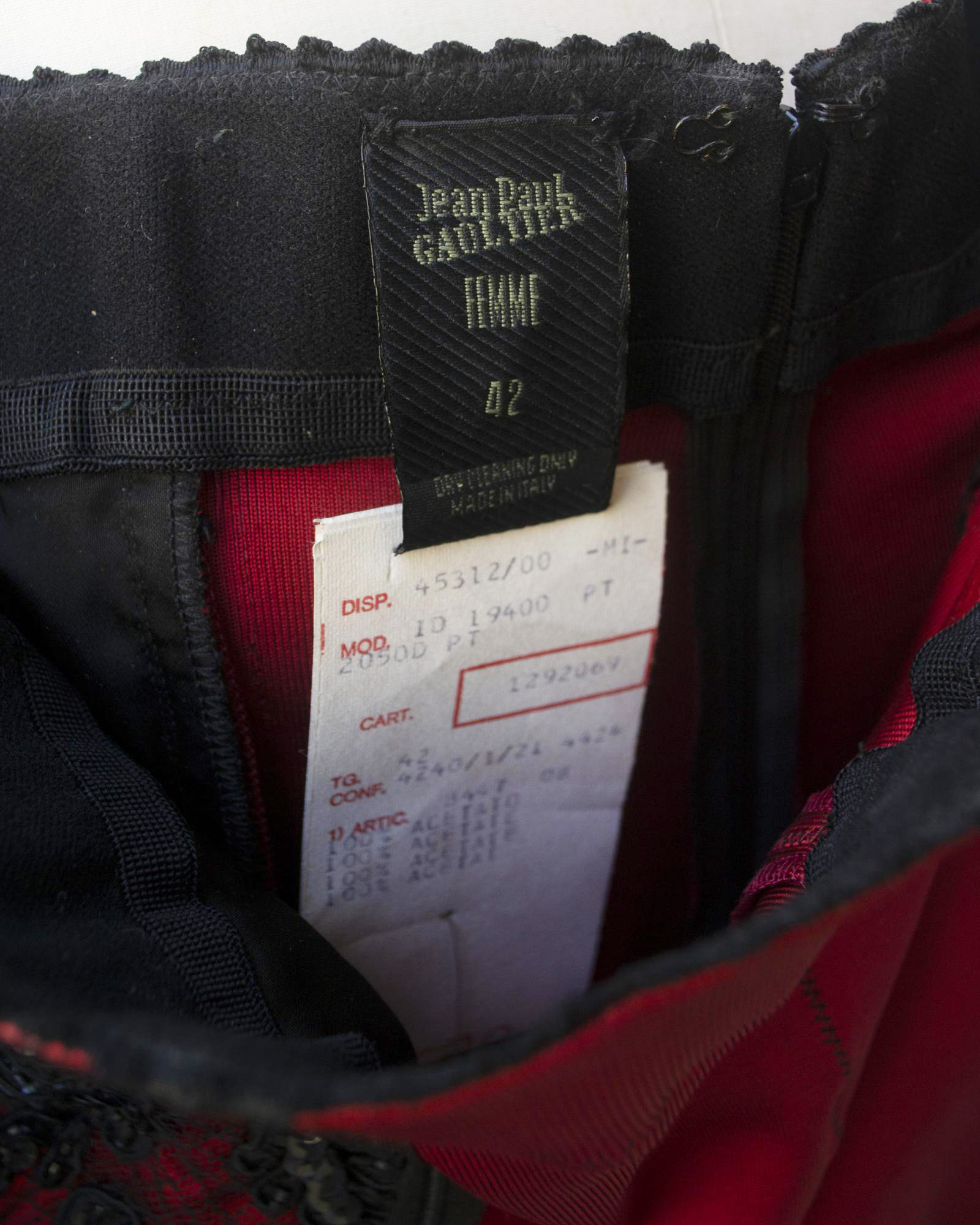 Shorts in red elastic fabric with black lace applique's embroidered with sequins of various types and sizes, black bottom with trimmings application. Center back lacing with invisible zip and hook. Made in Italy in 1988. Size IT 42. Never worn. Rare style. Made in Italy. Excellent condition.